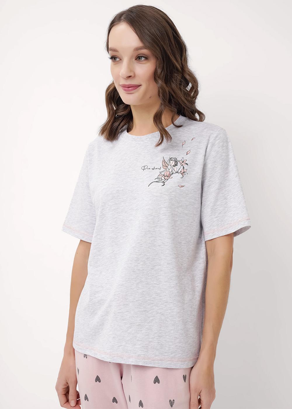 "Описание: Набор одежды из трикотажного полотна.Футболка прямого кроя, горловина с обтачкой. Короткий втачной рукав.Спереди принт.По низу рукава и изделия застилы.Брюки с притачным поясом на внутренней резинке с киперной лентой. Боковые карманы с отрезным бочком.