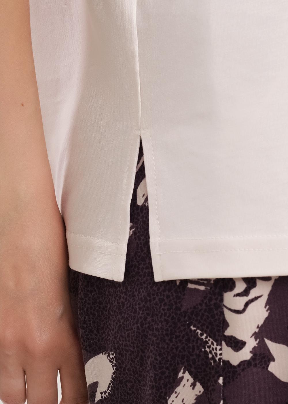 Набор одежды из трикотажного полотна с добавлением модала. Джемпер прямого кроя, втачной короткий рукав. Горловина с обтачкой. Спереди средний шов, рельефы,принт. Боковые разрезы. Брюки с поясом на резинке. Боковые карманы с отрезным бочком и кантом.