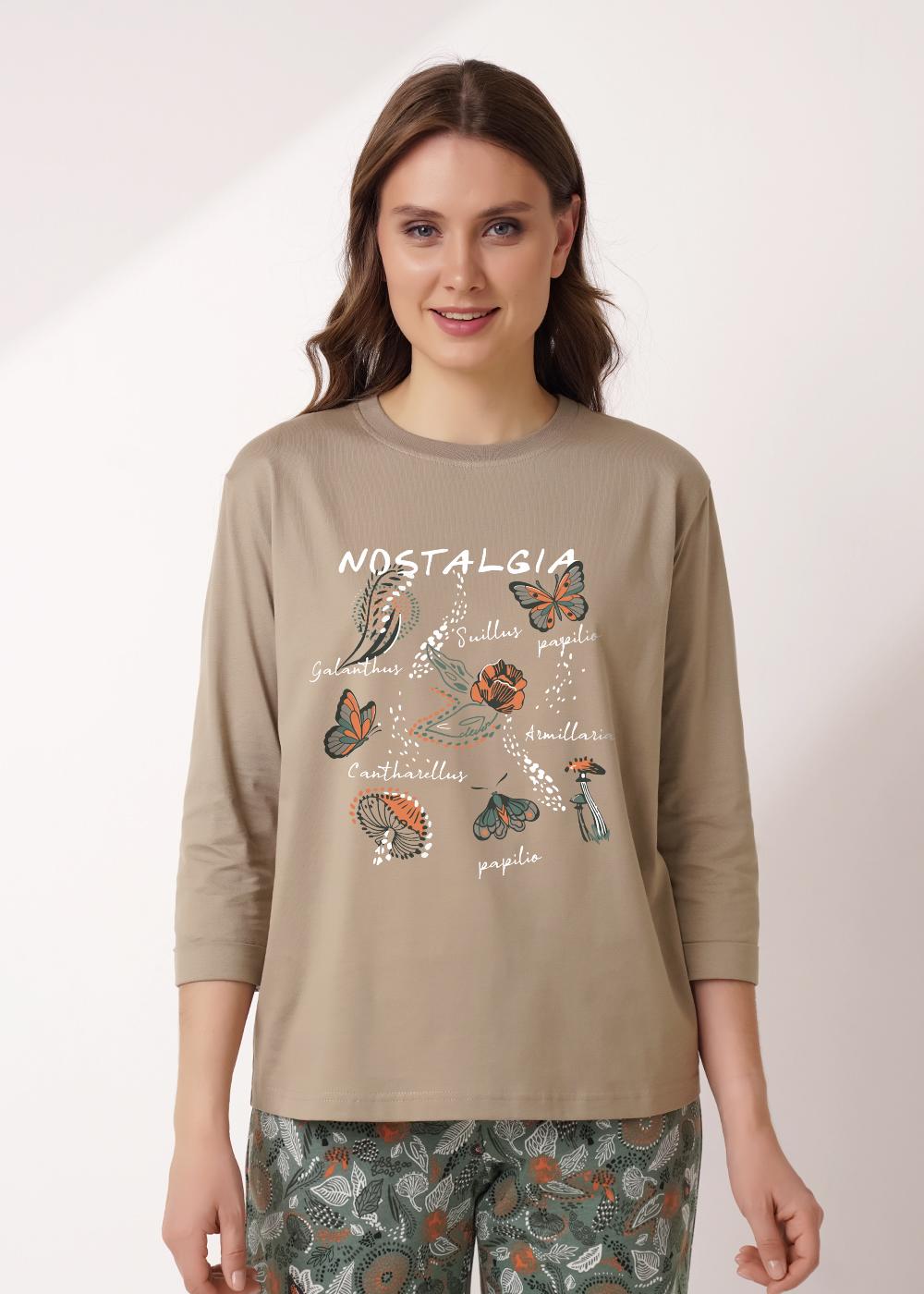 "Описание: Набор одежды из хлопкового трикотажного полотна.Фуфайка прямого кроя,втачной рукав длиной 7/8, внизу манжет с отворотом,закрепкой.Спереди принт.Брюки по талии пояс на внутренней резинке с атласной лентой.Боковые карманы с отрезным бочком.Внизу брюк кант.