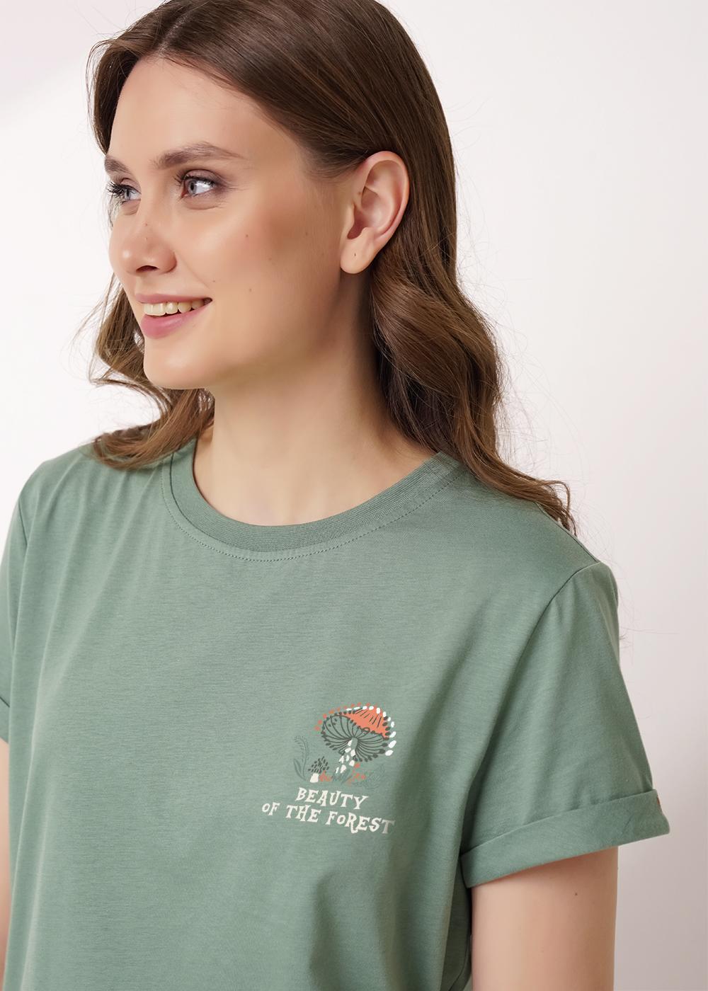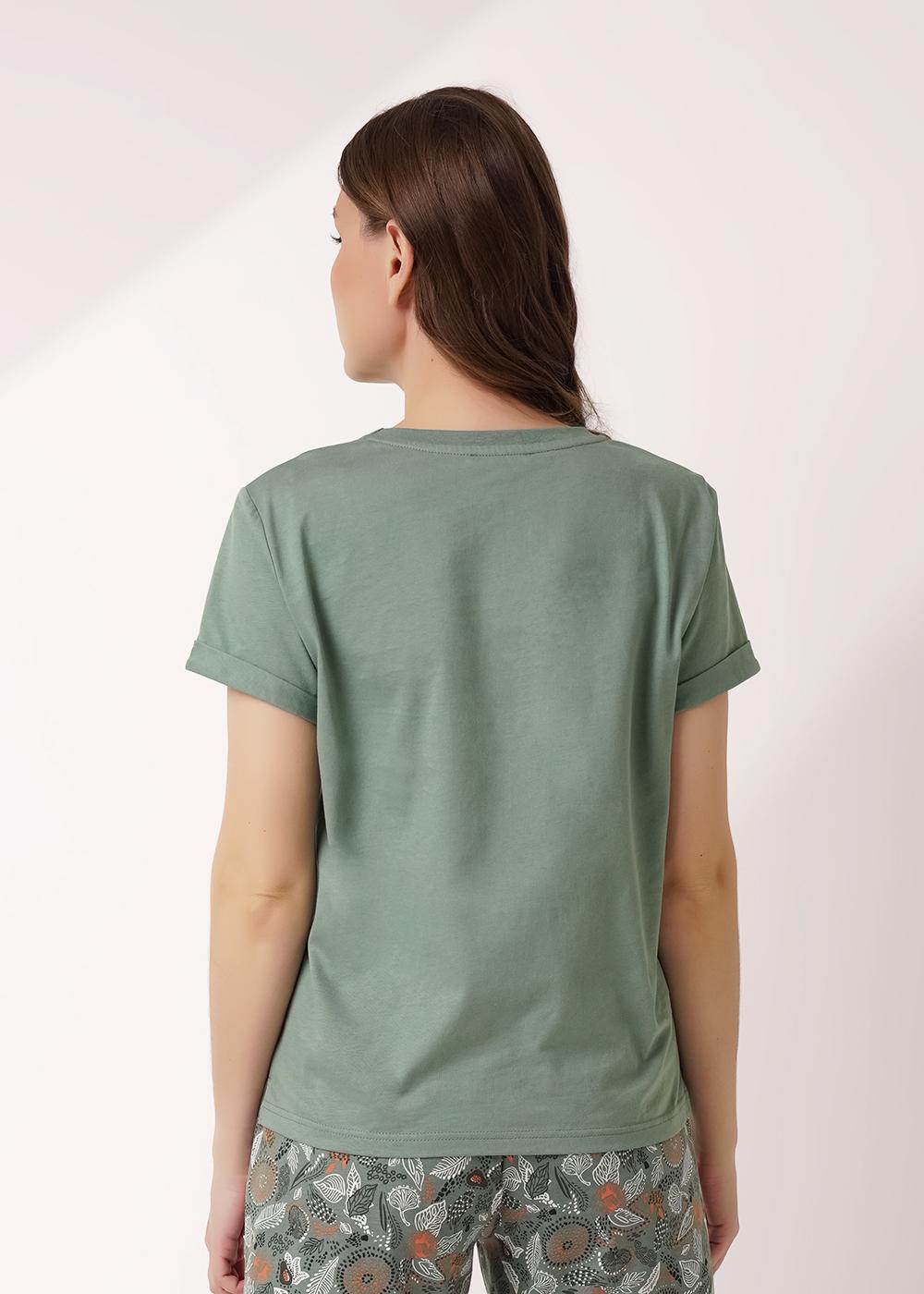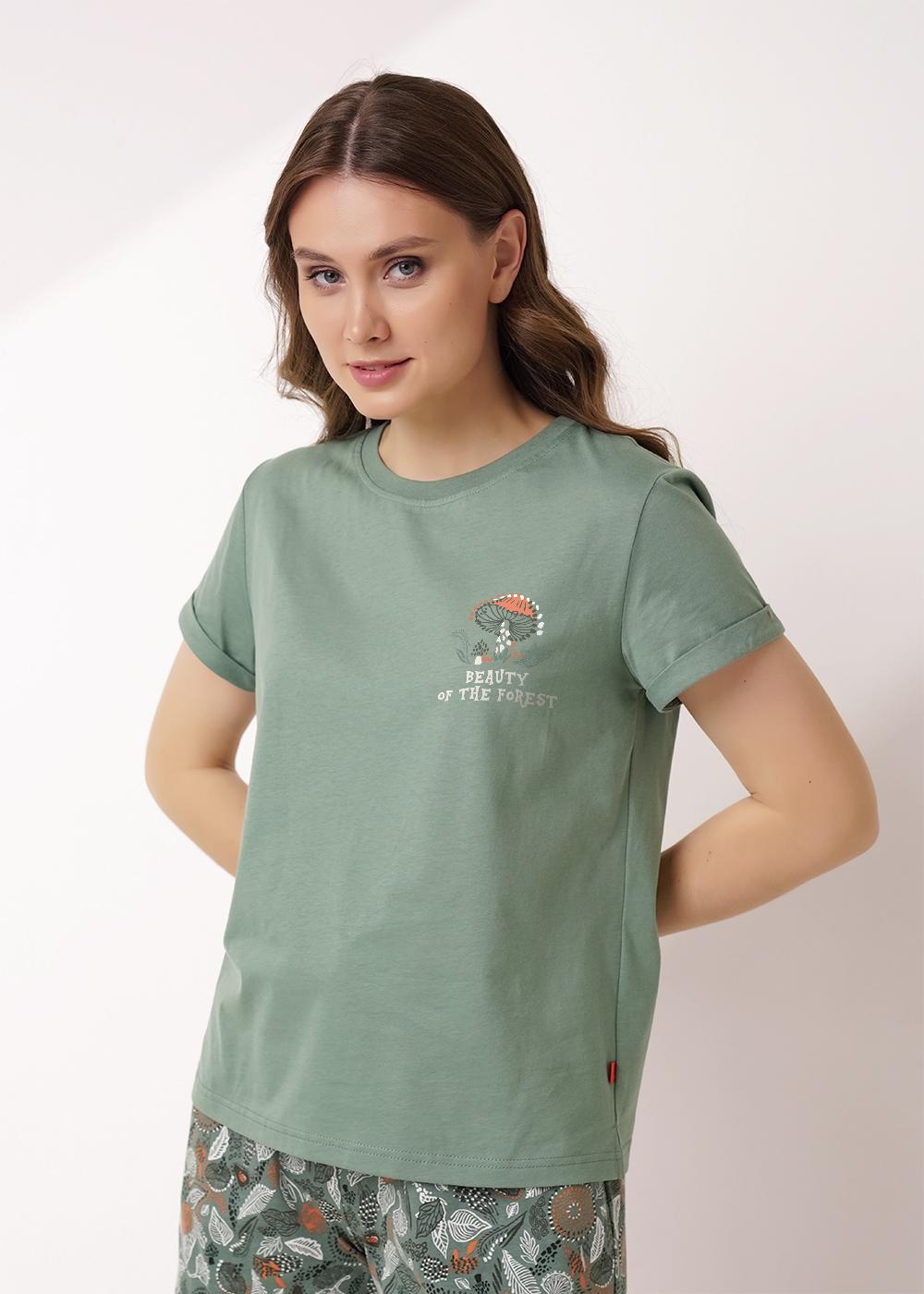 "Описание: Пижама из хлопкового трикотажного полотна.Футболка прямого силуэта, короткий втачной рукав внизу манжет с отворотом,закрепкой.Боковые разрезы,вшивка.Спереди принт.Шорты по талии резинка с атласной лентой.Боковые карманы с отрезным бочком.Внизу шорт кант.