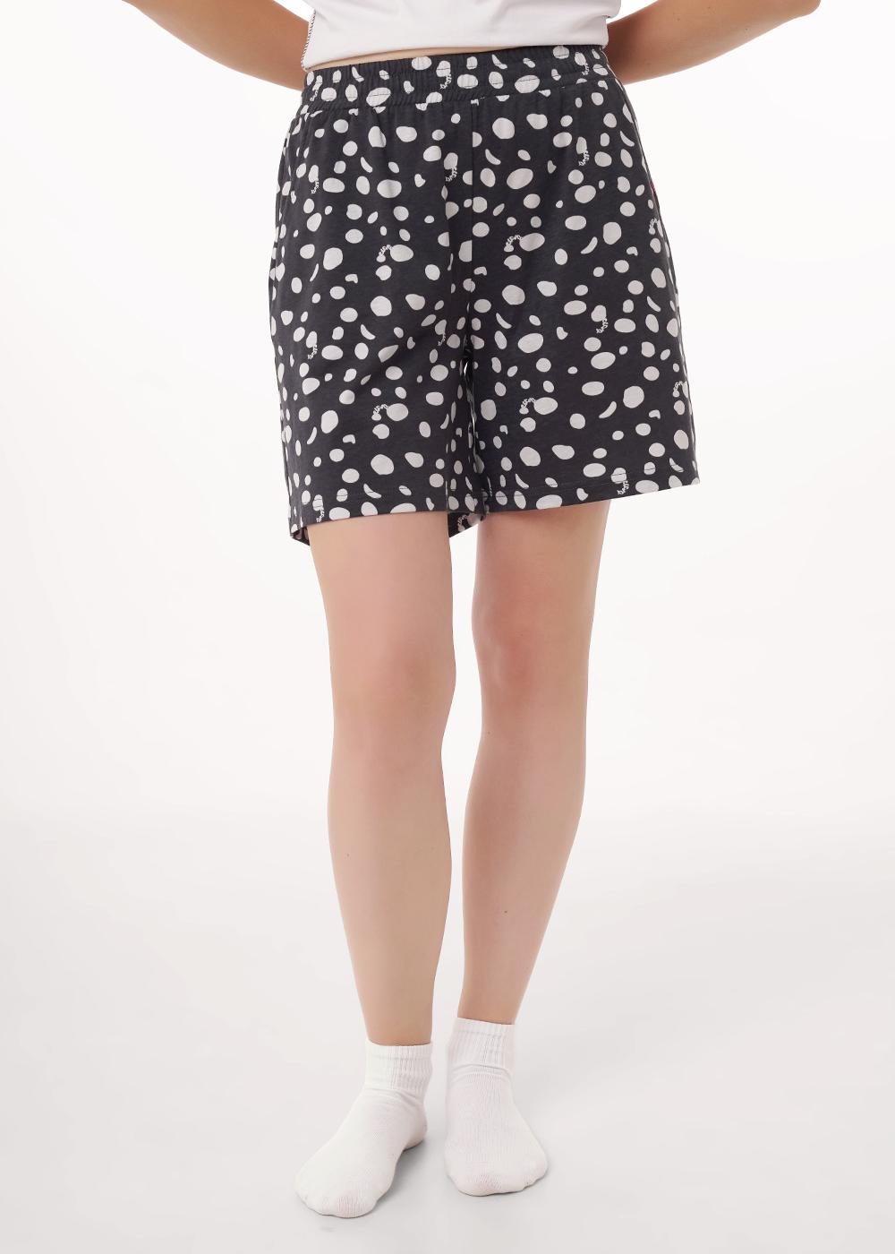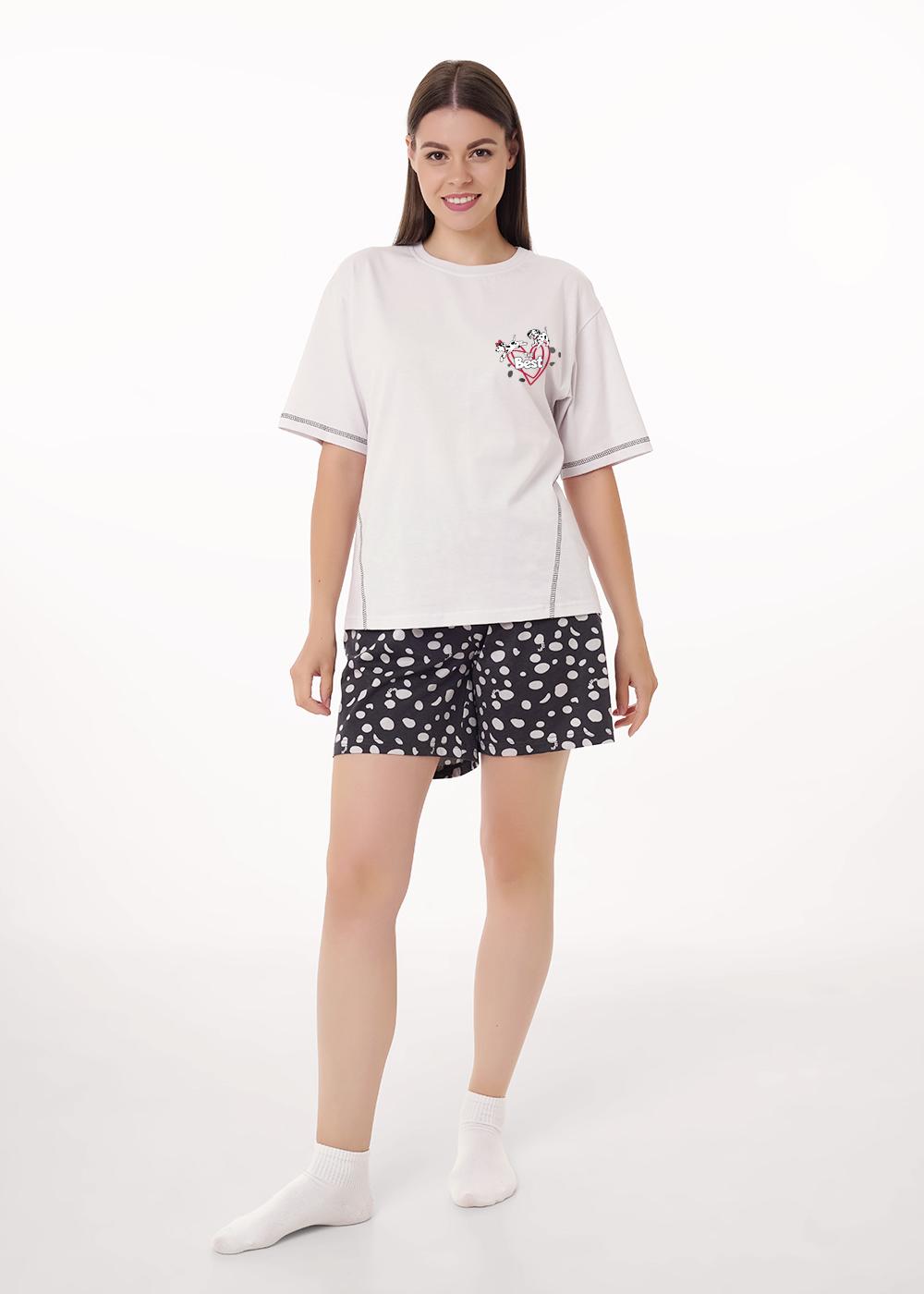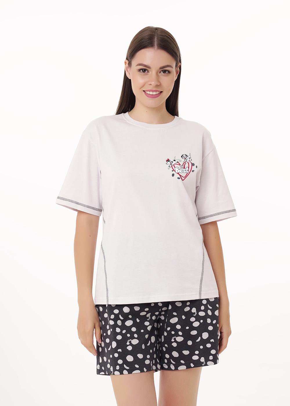 Набор одежды из трикотажного полотна. Футболка прямого кроя. Короткий втачной рукав, по низу рукава застил. Округлая горловина с обтачкой. Спереди резы с застилом,принт. Шорты с поясом на внутренней резинке. Боковые карманы с отрезным бочком,нашивка.