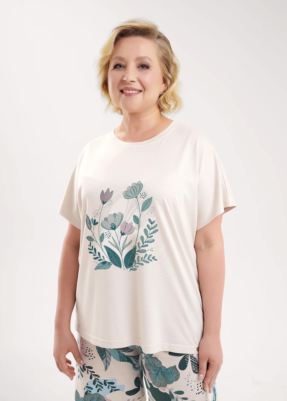 Пижама для дома и отдыха из трикотажного полотна с добавление модала.Футболка прямого кроя, короткий цельнокроенный рукав.Округлая горловина с обтачкой. Спереди принт,нашивка металл. Шорты с поясом на внутренней резинке.Боковые карманы с отрезным бочком.
