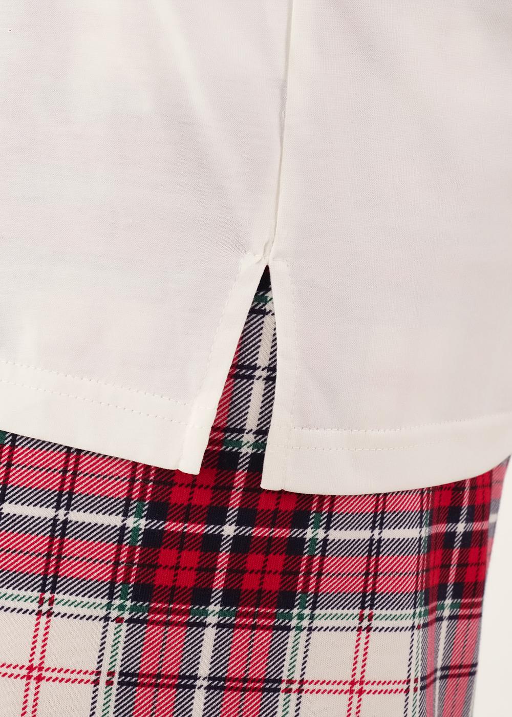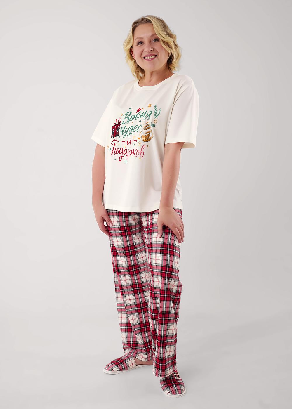 Пижама из хлопкового трикотажного полотна. Футболка прямого кроя. Короткий втачной рукав. Округлая горловина с обтачкой. Спереди принт. Боковые разрезы,вшивка. Брюки из трикотажного полотна с карбоном прямые, пояс на внутренней резинке с киперной лентой.