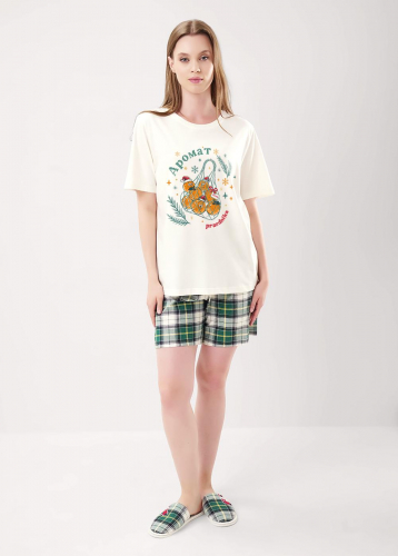 Пижама из хлопкового трикотажного полотна. Футболка прямого кроя. Короткий втачной рукав. Округлая горловина с обтачкой. Спереди принт. В боковом шве вшивка. Шорты из трикотажного полотна с карбоном прямые, пояс на внутренней резинке с киперной лентой.