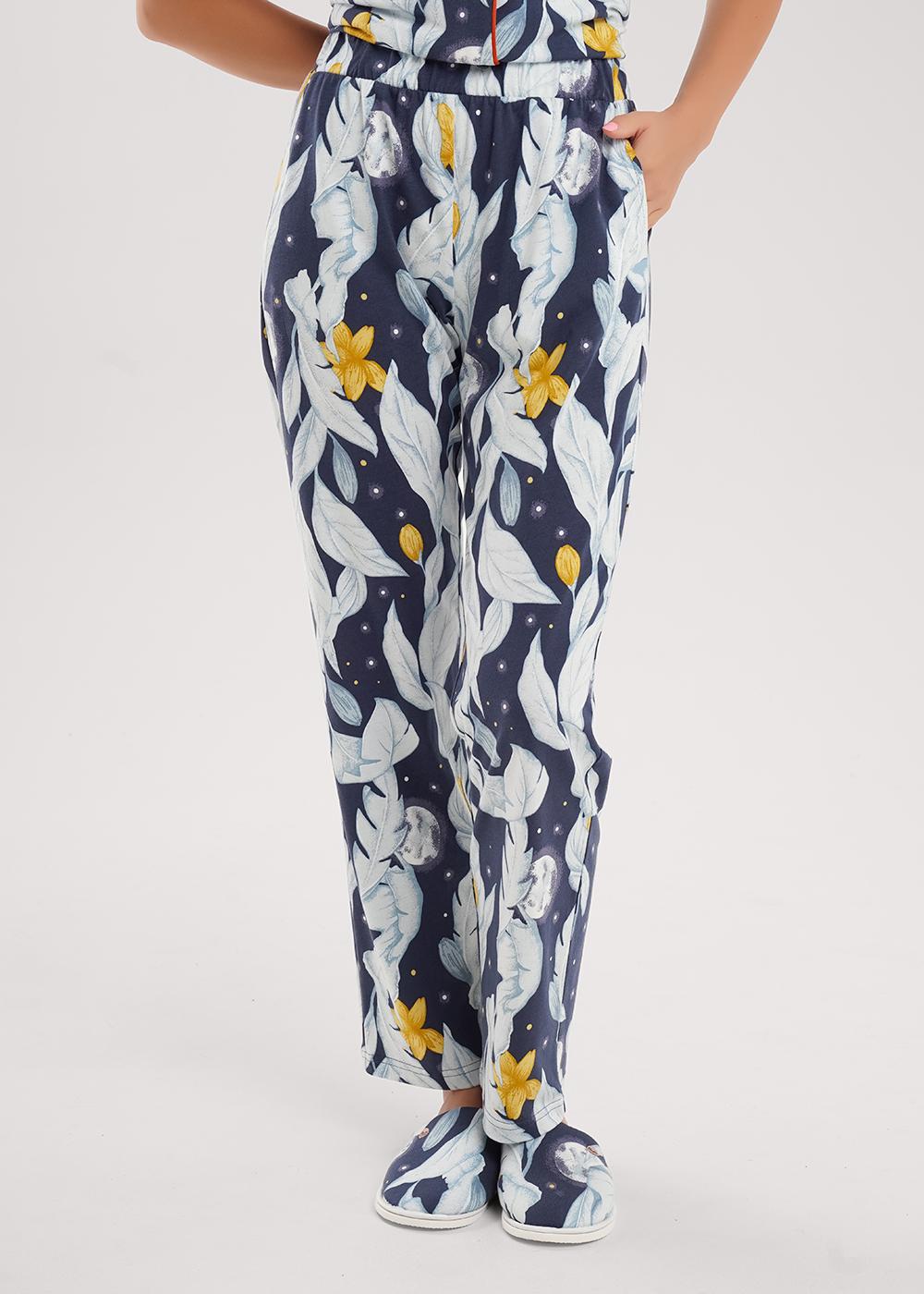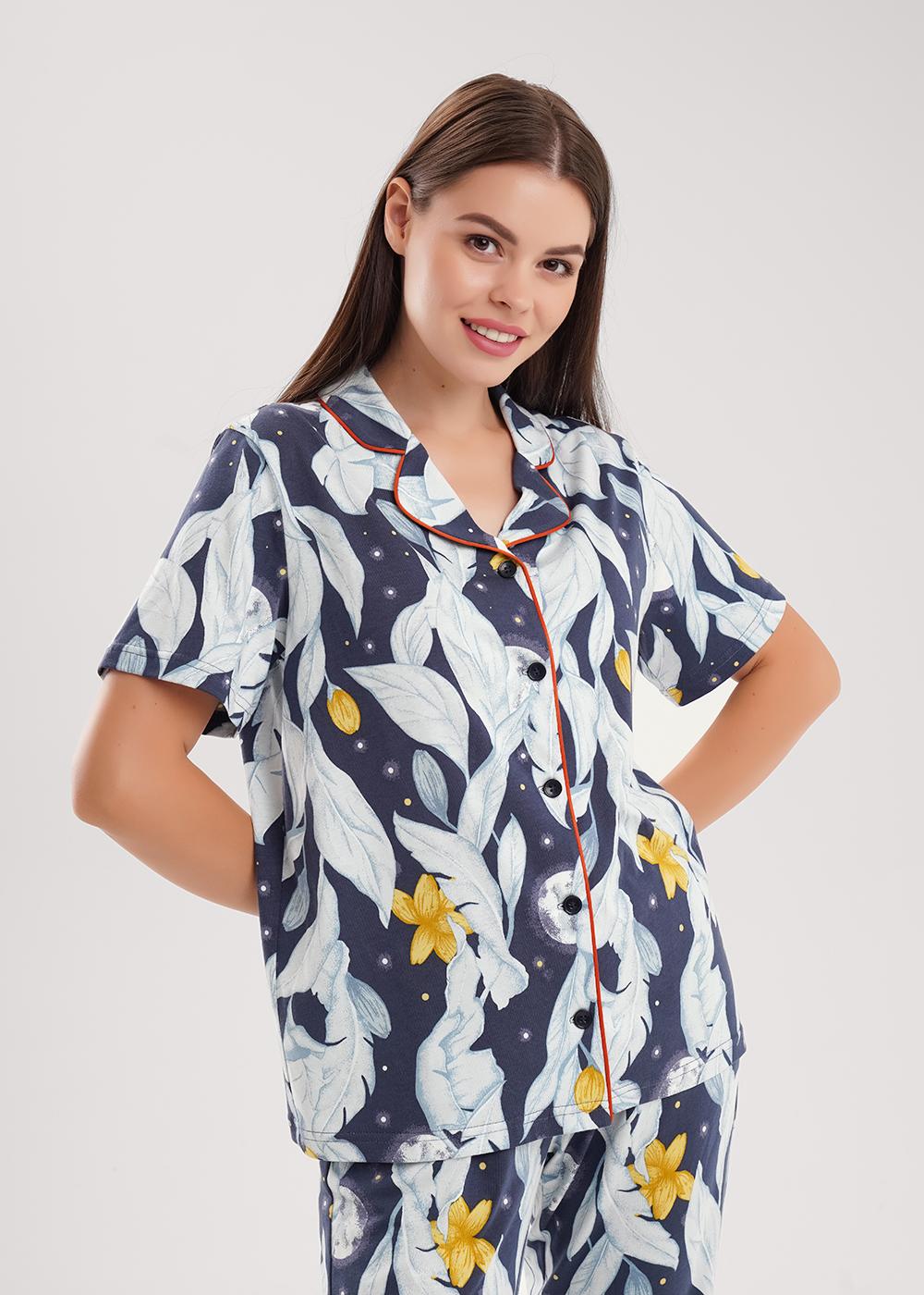 Набор одежды из хлопкового трикотажного полотна с добавлением модала. Джемпер с застежкой на пуговицы. Короткий втачной рукав. Отложной воротник с лацканами. По борту и лацканам кант. Брюки прямые с поясом на резинке. Боковые карманы с отрезным бочком.