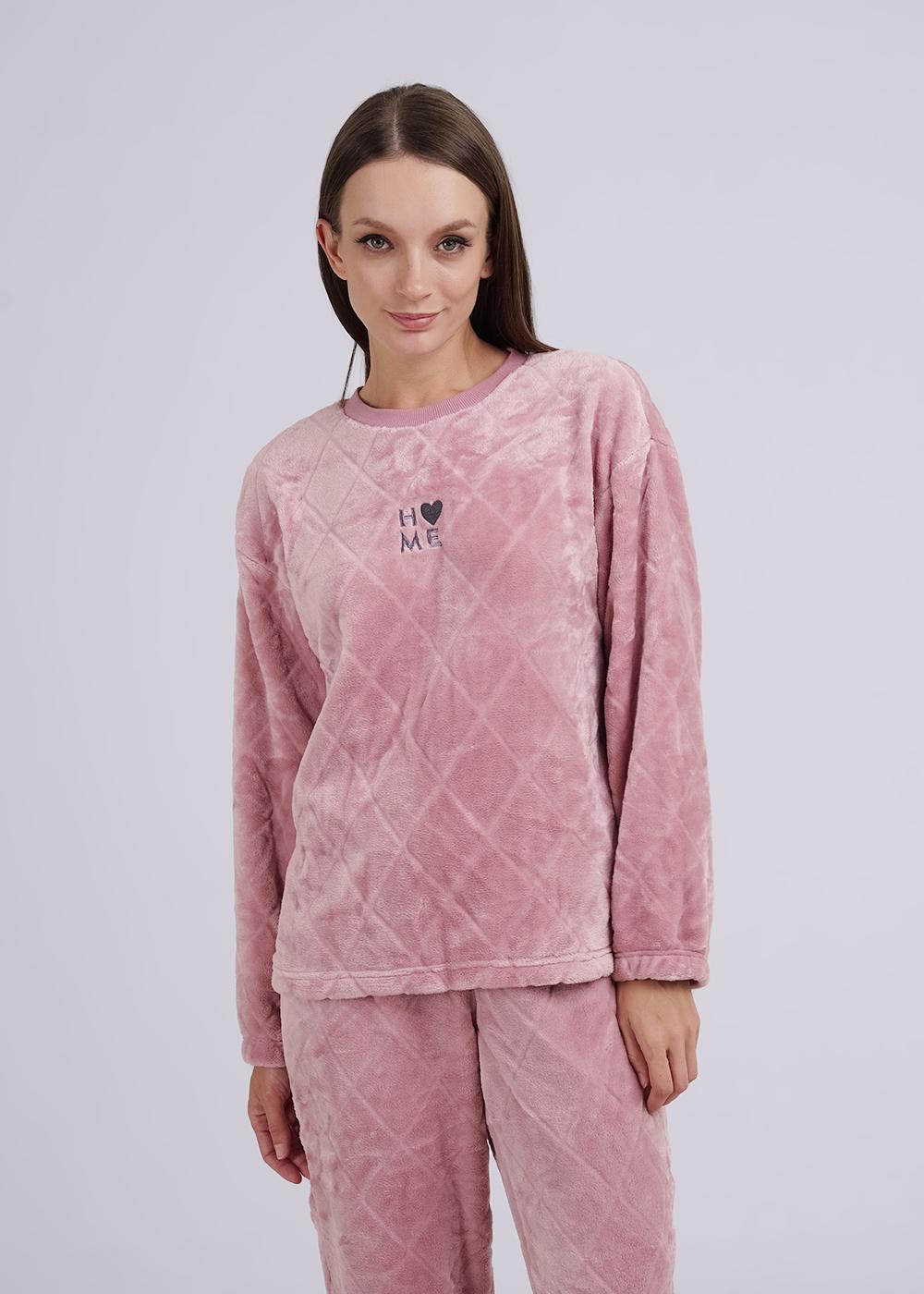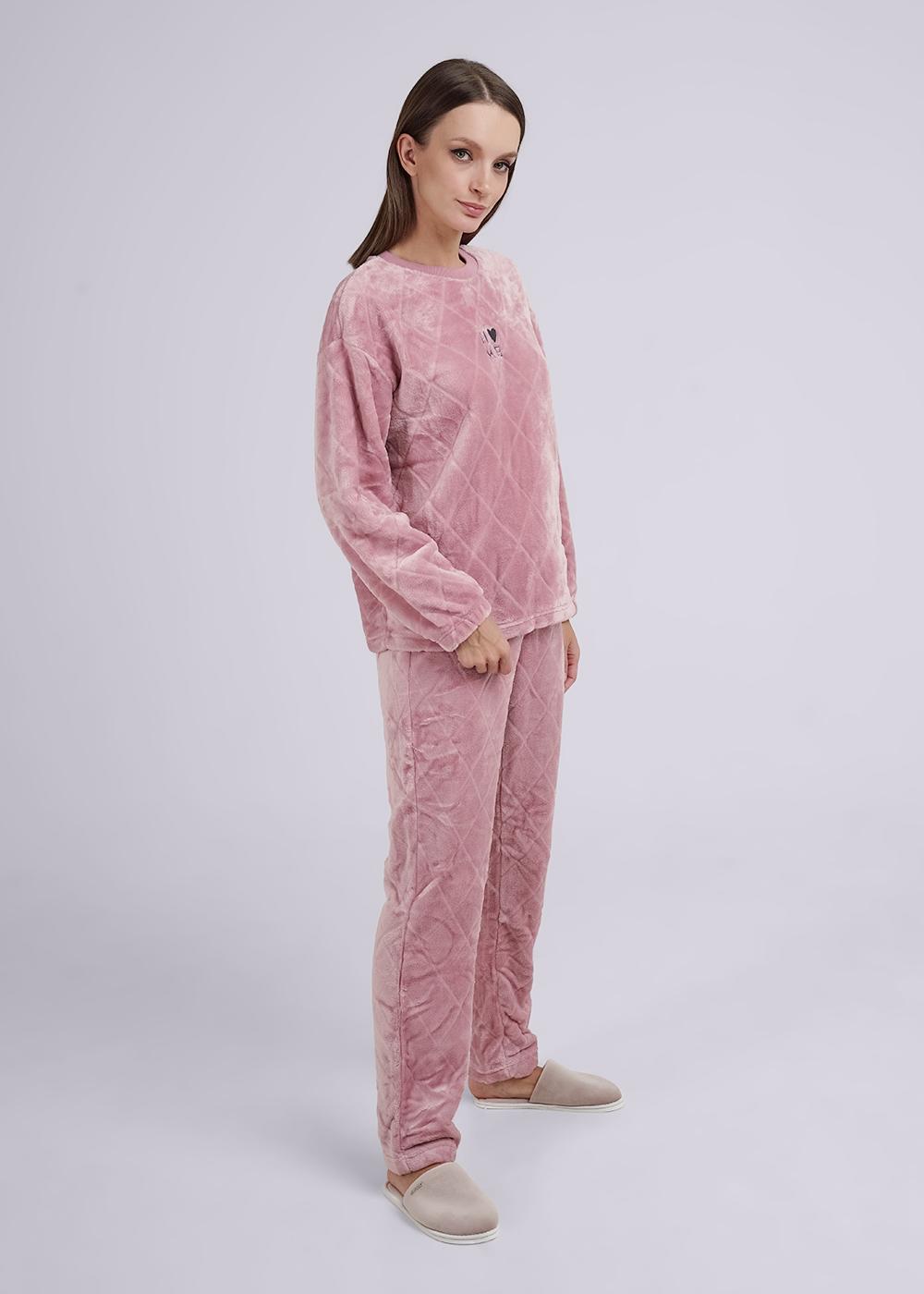 Женский костюм из фактурного велсофта, состоящий из джемпера и брюк. Джемпер прямого силуэта с горловиной, обработанной кашкорсе, рукавами полной длины, по низу рукавов резинка. Брюки прямые, с поясом на резинке.