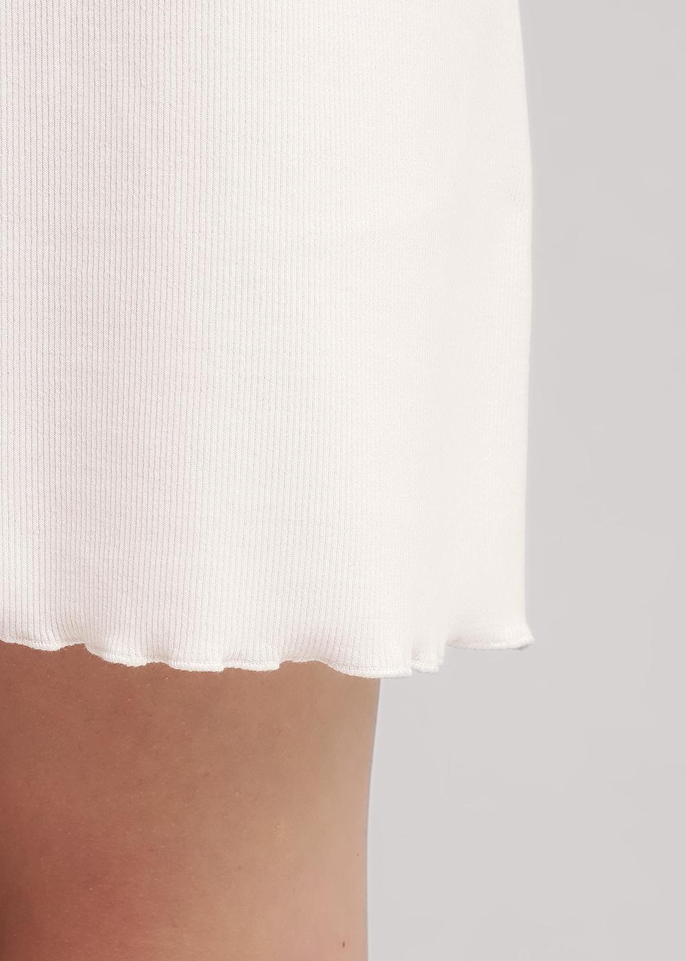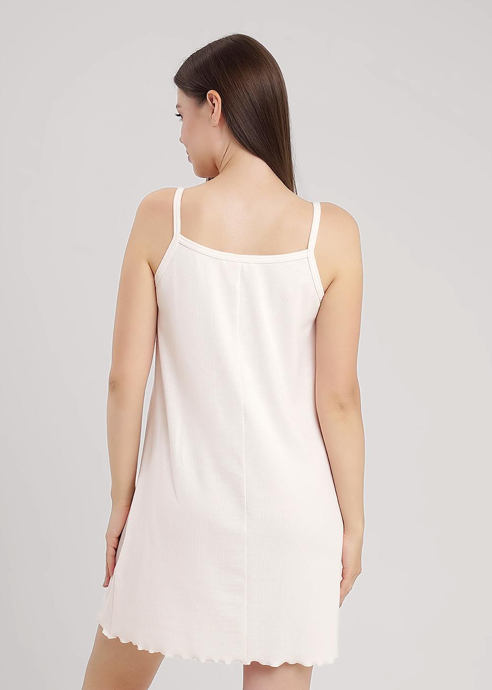 Сорочка ночная А-образного силуэта из трикотажного полотна кашкорсе лапша. Длиной чуть ниже колена, на узких бретелях. По горловине и пройме окантовка. По низу изделия мелкий оверлок.