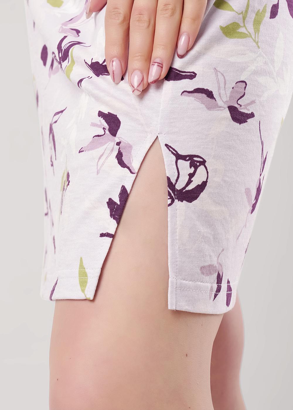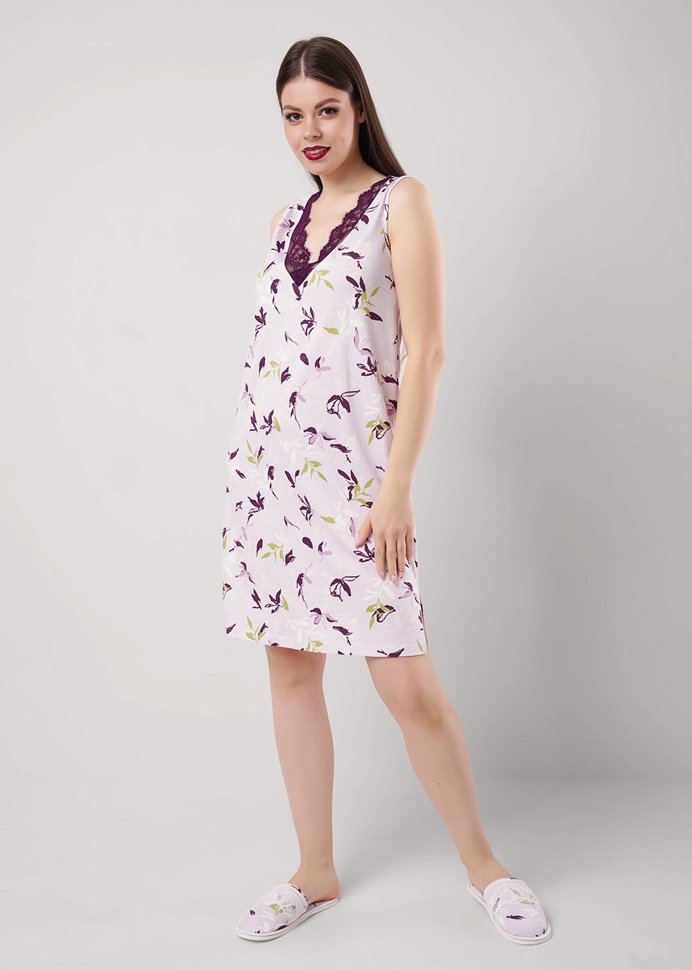 "Описание: Ночная сорочка из хлопкового трикотажного полотна с добавлением модала, А-образного силуэта длиной чуть ниже колена, на широких бретелях. По пройме окантовка. По горловине переда кружевная вставка. Боковые разрезы. На спинке средний шов.