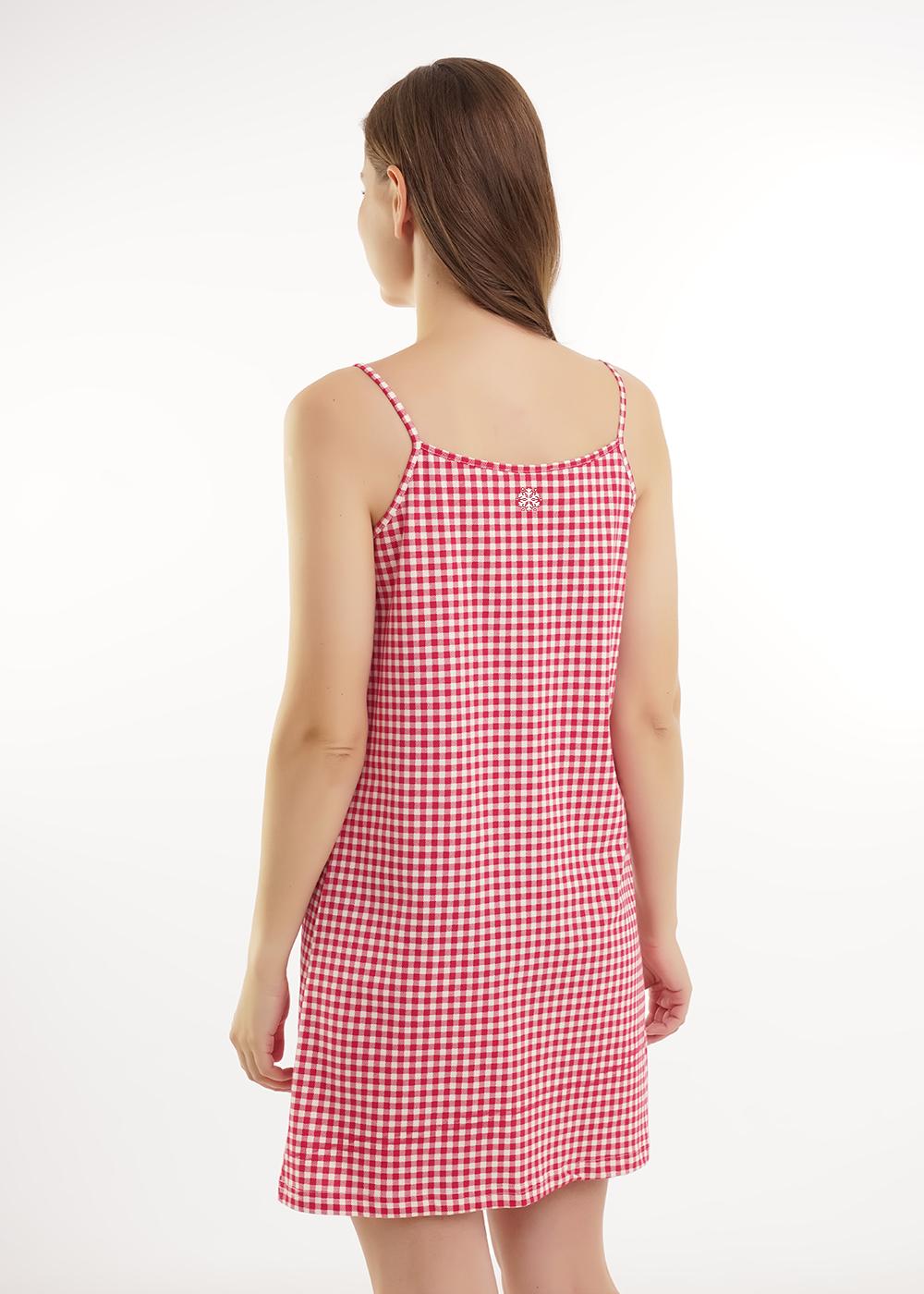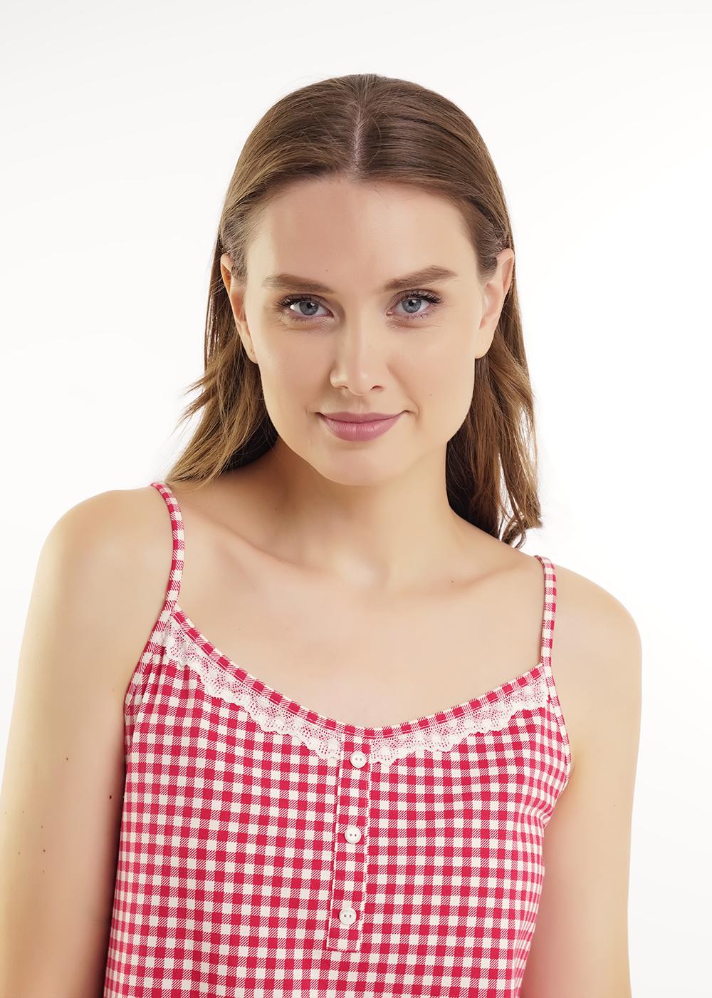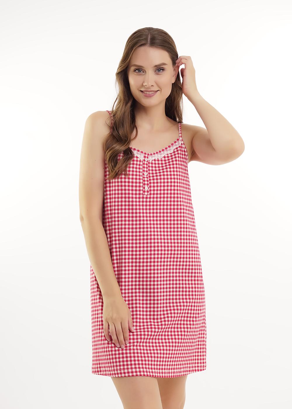 Ночная сорочка А-образного силуэта из хлопкового трикотажного полотна. Длиной чуть ниже колена, на узких бретелях. По горловине и пройме окантовка. По переду нефункциональная планка с пуговицами, вырез горловины декорирован кружевом. На спинке принт.