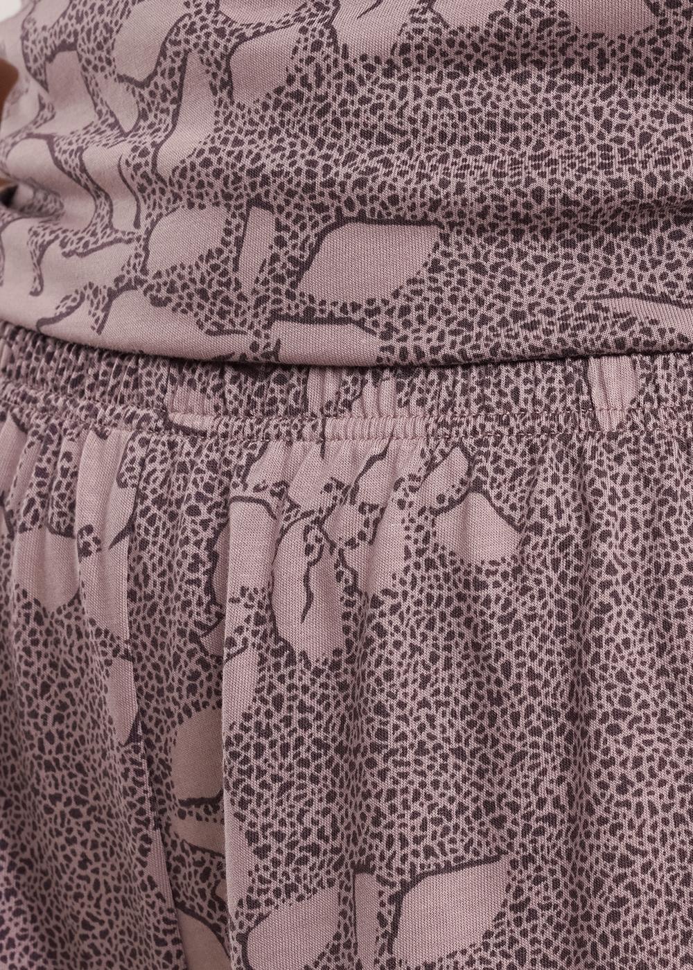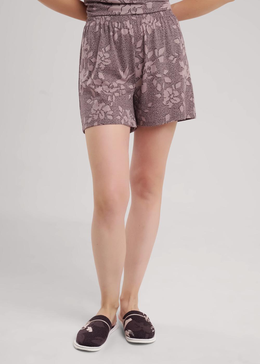 Пижама для дома из трикотажного полотна с добавлением модала. Майка умеренного объема на бретеля. По горловине переда обтачка с кантом, бант. По пройме окантовка. Короткие шорты свободного кроя, цельнокроеный пояс на внутренней резинке.