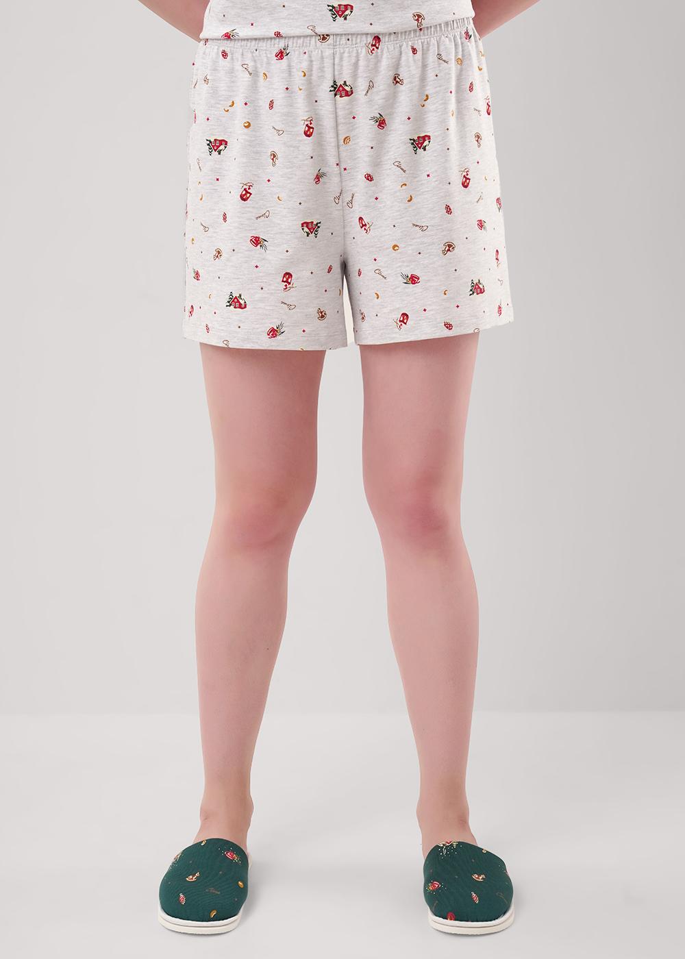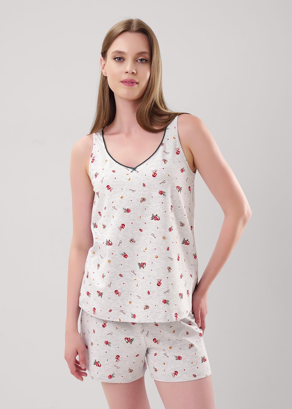 Пижама из хлопкового трикотажного полотна с эластаном. Майка прямого кроя на бретелях. По горловине ажурная резинка, бант. По пройме окантовка. Короткие шорты свободного кроя, цельнокроеный пояс на внутренней резинке.