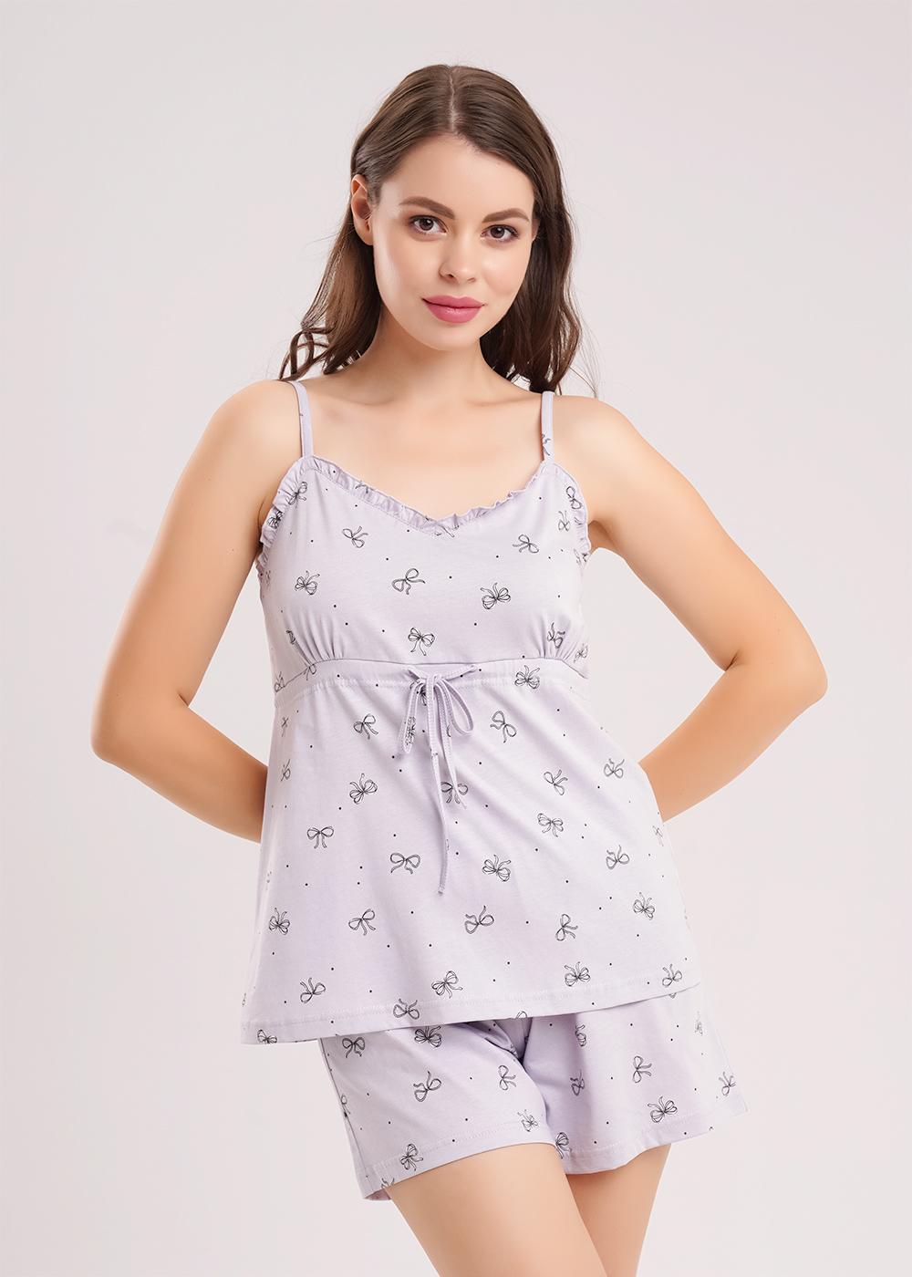 Пижама из хлопкового трикотажного полотна. Майка на узких бретелях. Отрезной лиф с кулисой и шнуром из окантовки. По горловине переда рюша с обработкой мелкий оверлок. По пройме окантовка. По верху лифа спинки резинка. Шорты с поясом на резинке.