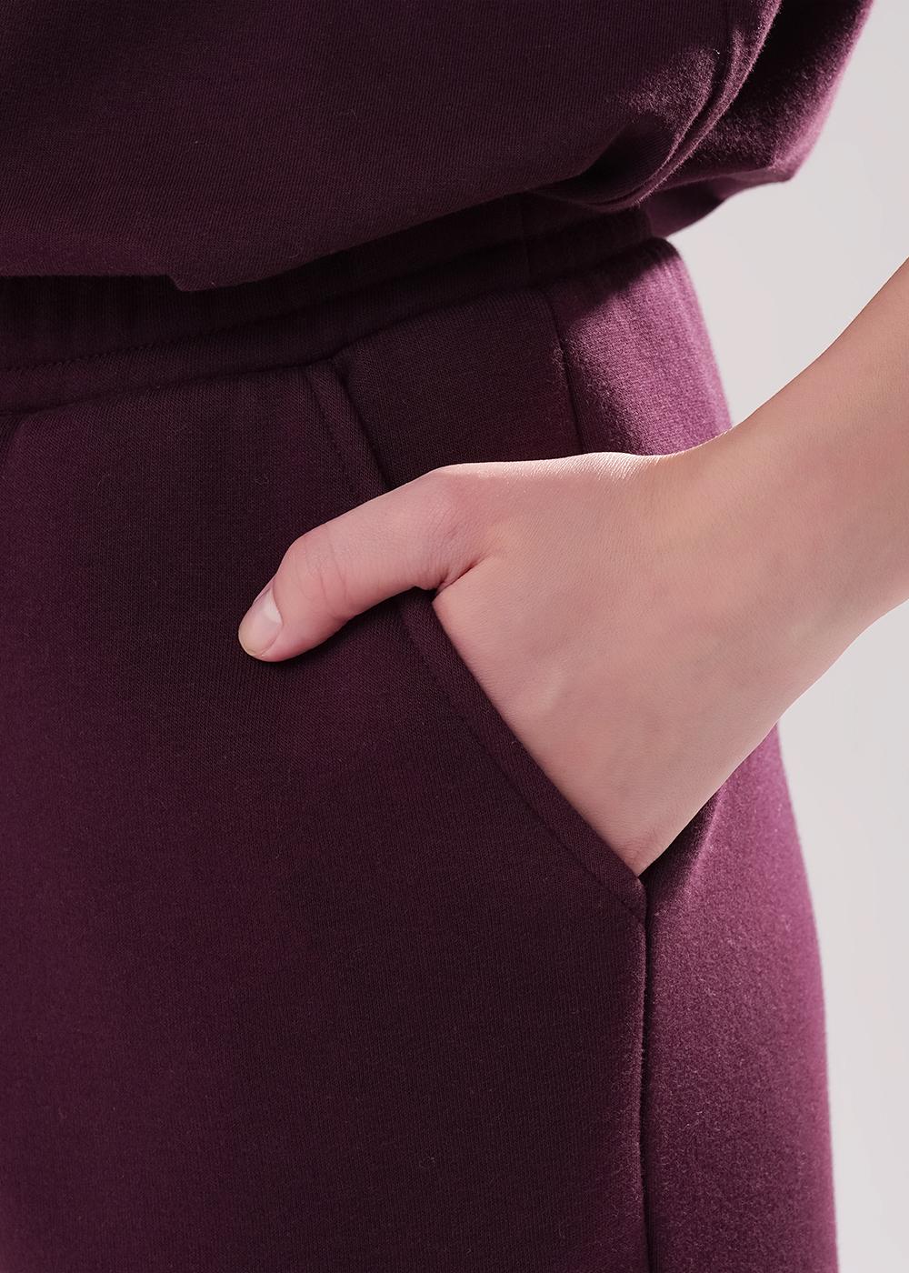 Брюки спортивные из трикотажного полотна футер с начесом,зауженные книзу. По талии пояс на резинке и внутренним шнуром. По низу брюк подгибка с внутренней резинкой. Боковые карманы с отрезным бочком.