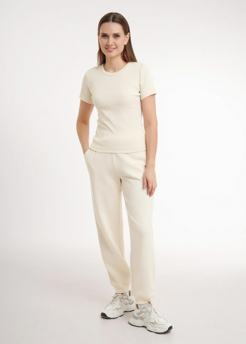 Брюки спортивные свободные из трикотажного полотна дабл фейс. По талии притачной пояс на внутренней резинке, по низу брюк манжет из кашкорсе. Боковые карманы с отрезным бочком, накладной карман по спинке. Спереди принт.
