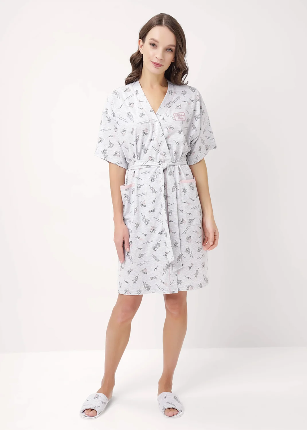 Халат из хлопкового трикотажного полотна на запах. По борту обтачка с контрастным кантом. По талии съёмный пояс, внутренние завязки. Накладные карманы с контрастной обтачкой. Спущенная линия плеча с рукавом длиной 3/4. Спереди ажурная нашивка.