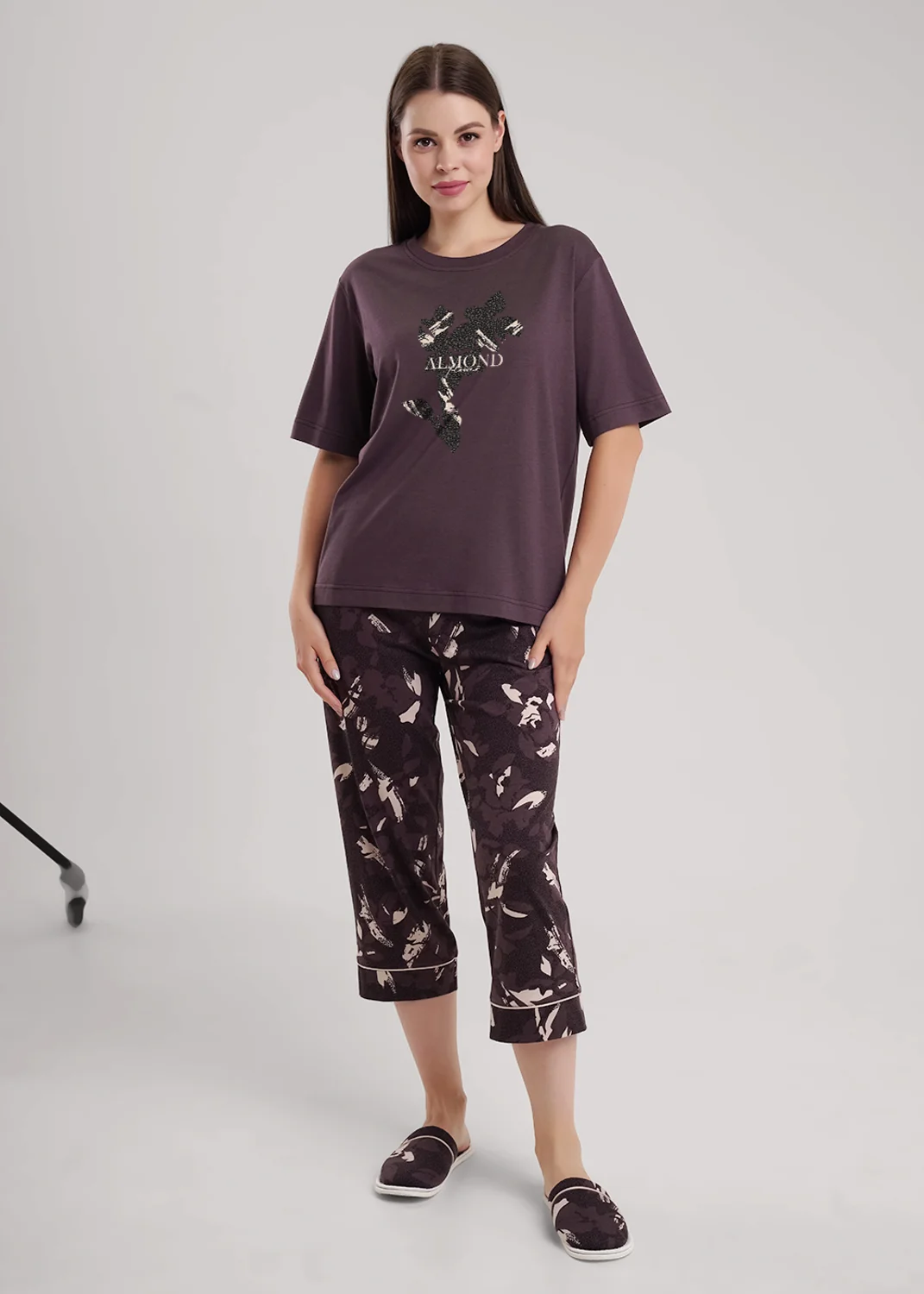Набор одежды из трикотажного полотна с добавлением модала. Футболка прямого кроя, втачной короткий рукав. Округлая горловина с обтачкой. Спереди принт. Бриджы с поясом на резинке, нашивка, по низу манжет с кантом. Боковые карманы с отрезным бочком.