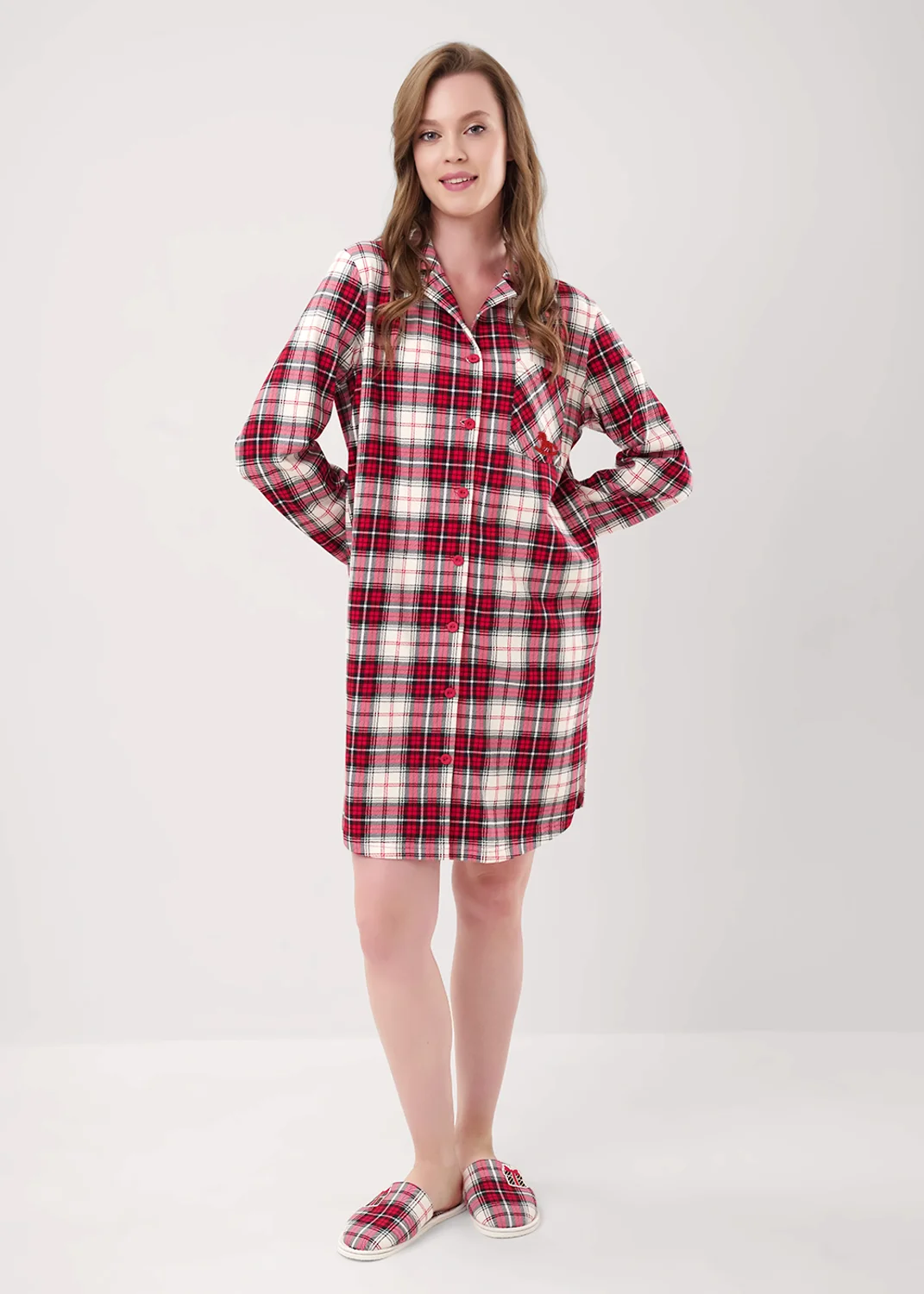 Платье-рубашка для дома и отдыха из хлопкового трикотажного полотна с карбоном, прямого силуэта. Втачной длинный рукав. Застёжка на пуговицы, воротник с лацканами. На детали переда накладной карман, нашивка. Низ изделия округлой формы, по бокам разрезы.