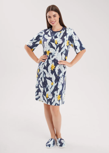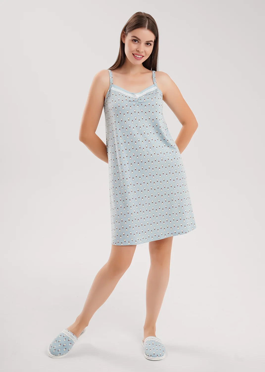 Сорочка ночная из трикотажного полотна с добавлением модала. А-силуэта на узких бретелях. По горловине переда кокетка с кружевом, по центру сборка на резинку, металлическая нашивка.