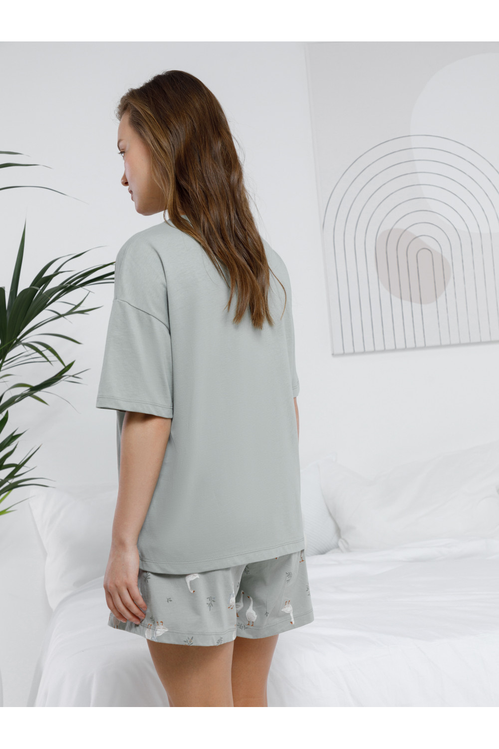 Комплект для комфортного сна и отдыха из трикотажного полотна с набивным рисунком и принтом. Футболка с короткими спущенными рукавами и шорты с мягкой эластичной резинкой в поясе, которые удобно садятся по фигуре. Гладкий материал приятен к телу, не теряет форму и позволяет коже дышать.