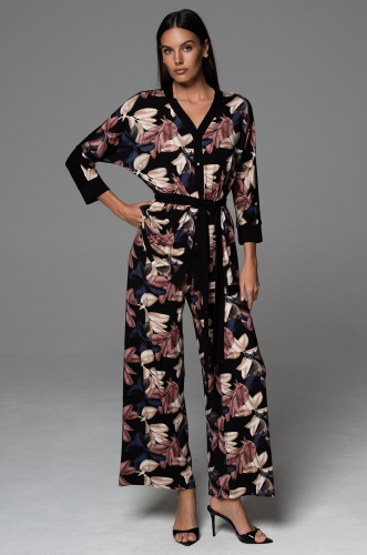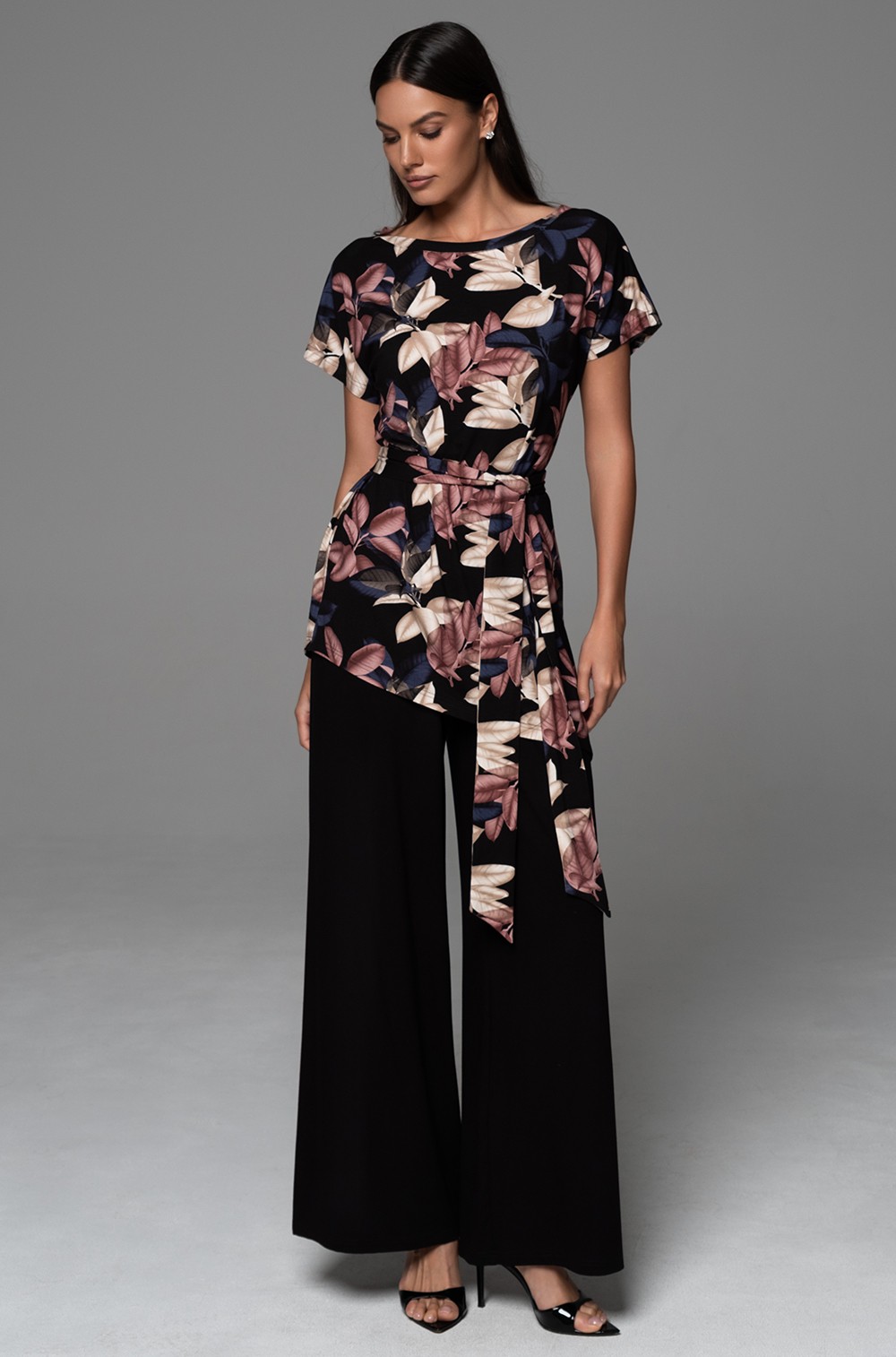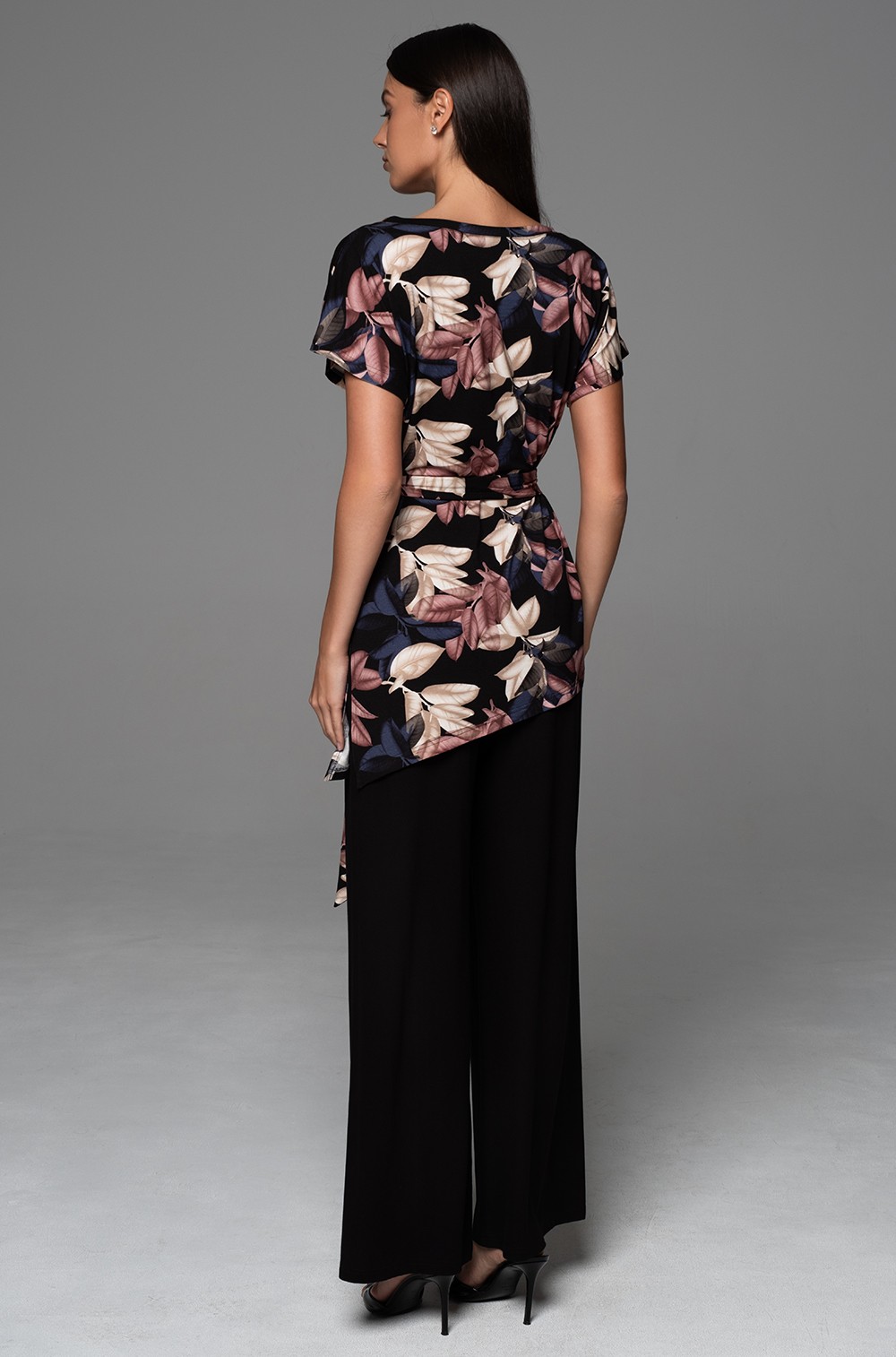Комплект Mia-Amore состоит из свободного топа с коротким рукавом и ассиметричной линией низа и широких брюк. Топ выполнен из принтованного трикотажного полотна, брюки полностью однотонные. Линию талии можно подчеркнуть за счет пояса, который идет в комплекте.