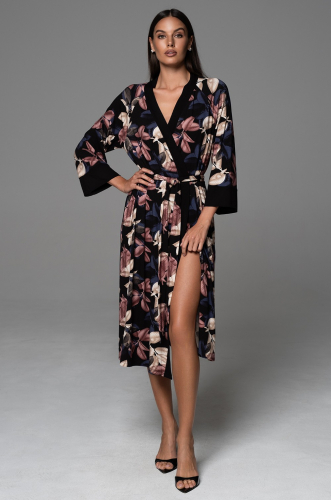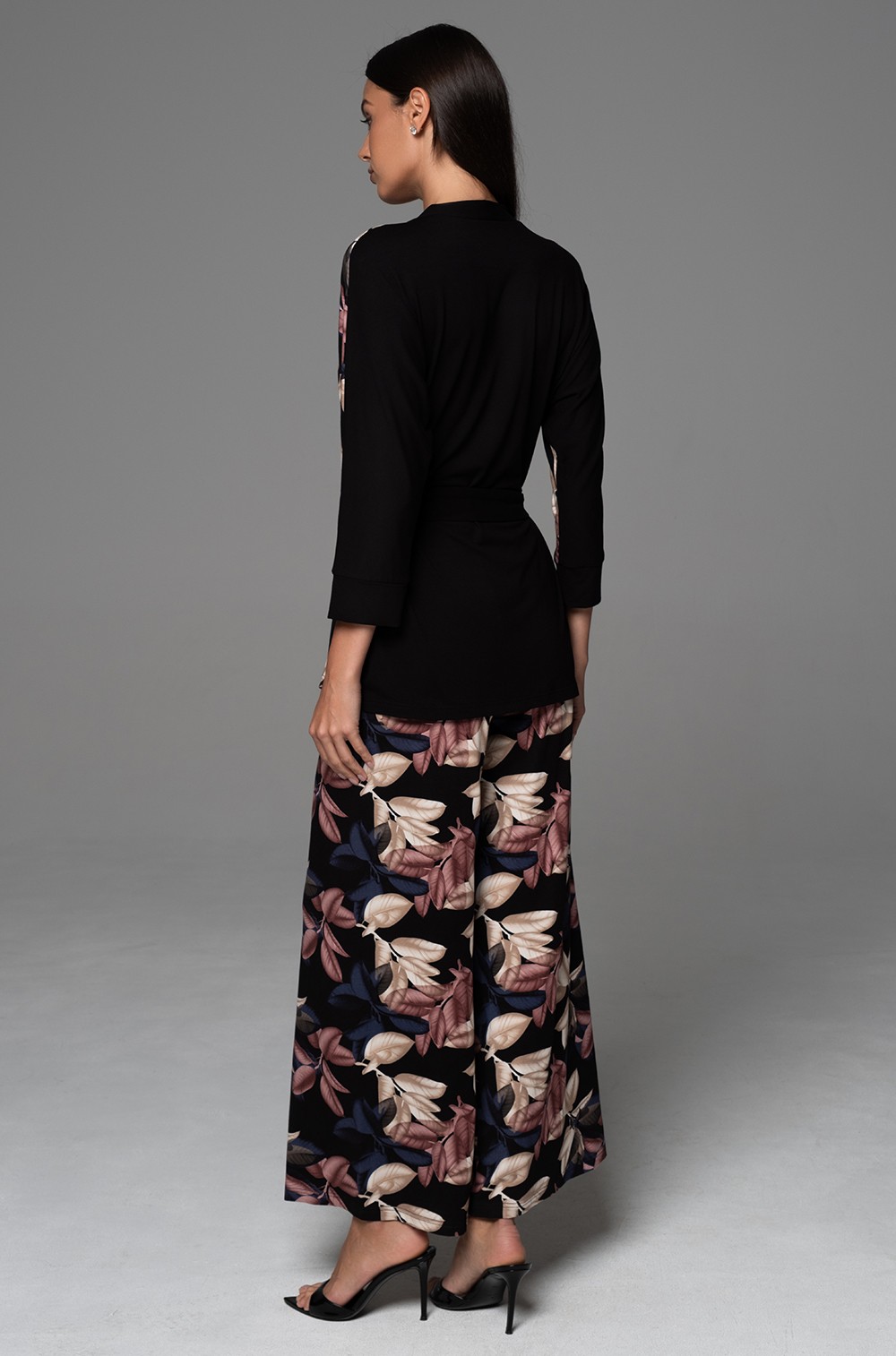 Комплект Mia-Amore состоит из кардигана с рукавом ¾ и широких брюк. Топ выполнен из принтованного трикотажного полотна с однотонной отделкой, брюки полностью принтованные. Линию талии можно подчеркнуть за счет пояса, который идет в комплекте.