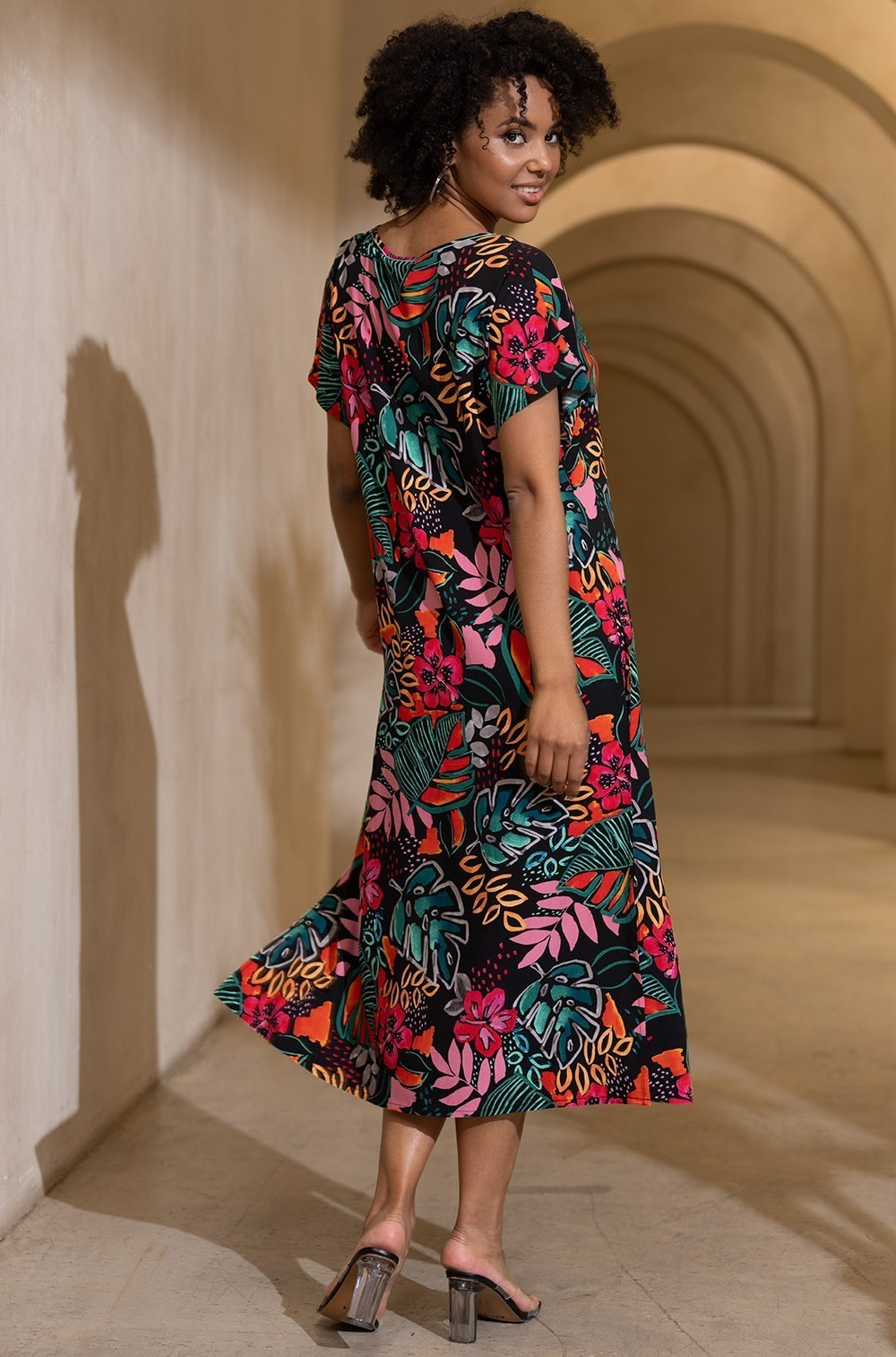 Длинная туника Mia-Amore свободного силуэта с коротким рукавом. Изделие выполнено из тканой принтованной вискозы с контрастными кантами в виде отделки. По бокам туники обработаны карманы. По низу изделия расположены разрезы для свободы движения. Линию талии можно подчеркнуть за счет пояса, который идет в комплекте.
