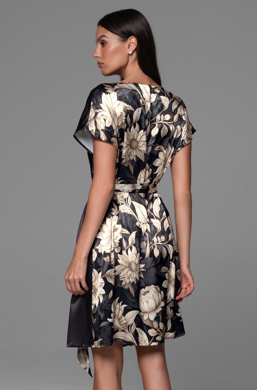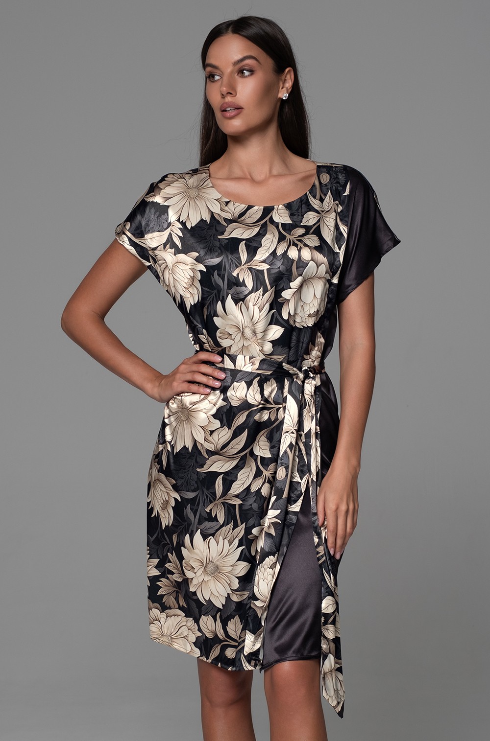 Короткая запашная туника Mia-Amore свободного силуэта с коротким рукавом. Изделие выполнено из двух видов смесового шелка: принтованного и однотонного. По бокам расположены карманы. Линию талии можно подчеркнуть за счет пояса, который идет в комплекте.
