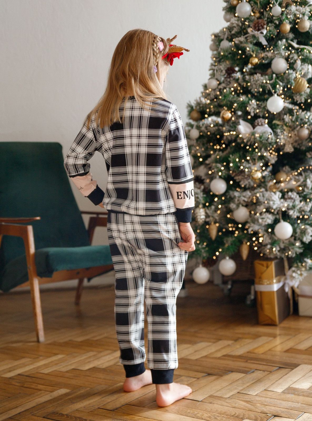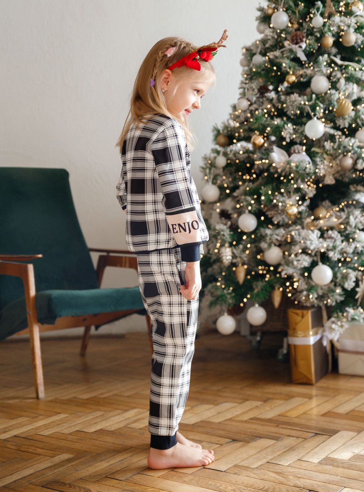 Брюки также изготовлены из хлопка в клетку. Они идут на мягкой резинке с регулирующим шнурком.