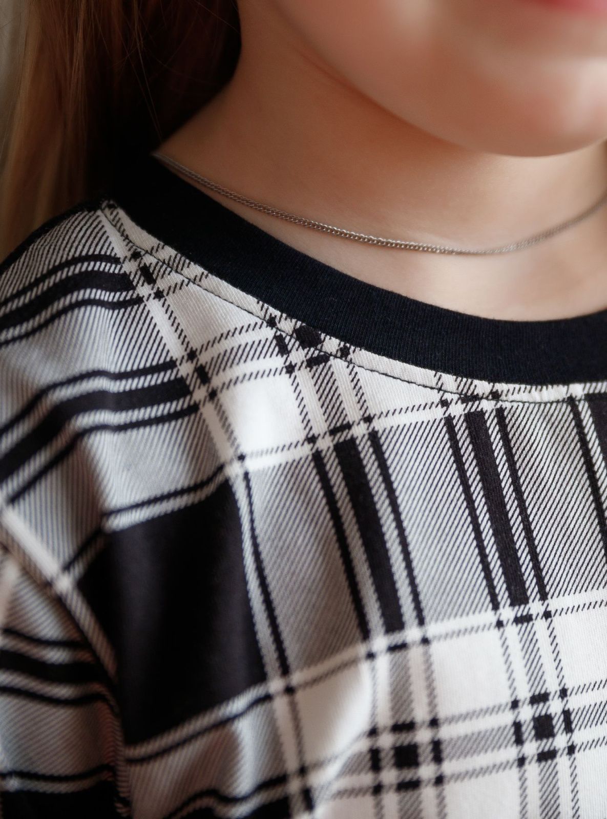 Кофта свободного кроя изготовлена из хлопка в клетку, с принтом-нашивкой на рукавах.