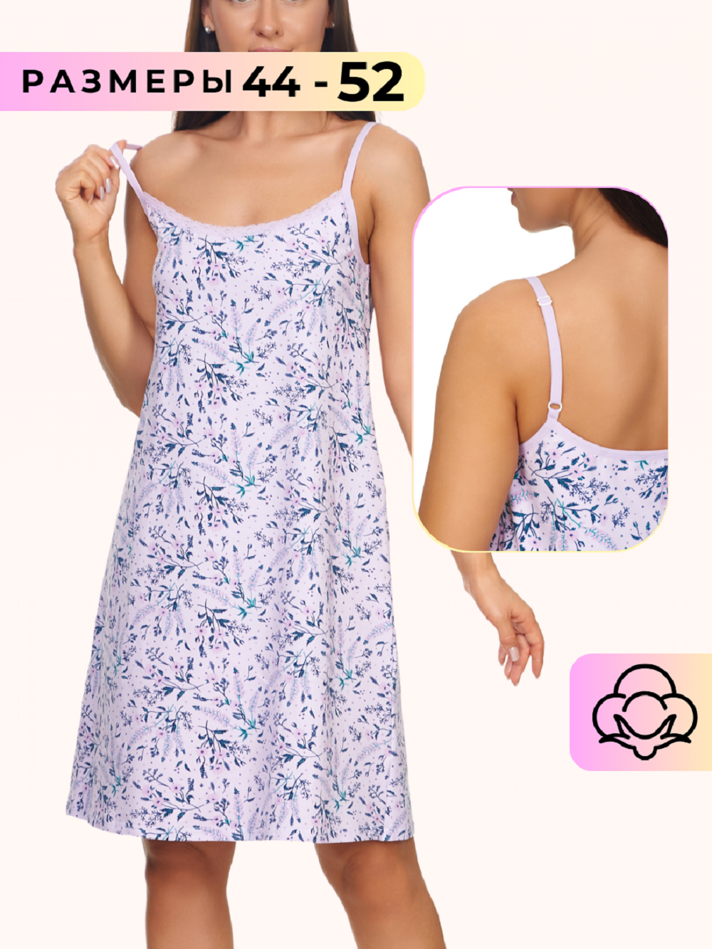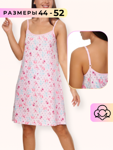 Сорочка женская выполнена из приятного хлопкового трикотажного полотна с милым цветочным рисунком. Сорочка свободного кроя и оптимальной длины. Бретели выполнены из эластичной плоской резинки с регулятором длинны, что добавляет комфорта при носке сорочки, так как позволяет регулировать длину бретели, не оказывая давления на тело. По полочке выполнено нежное кружево. Сборка по полочке дает дополнительный объем в области груди, не стесняя в движений.