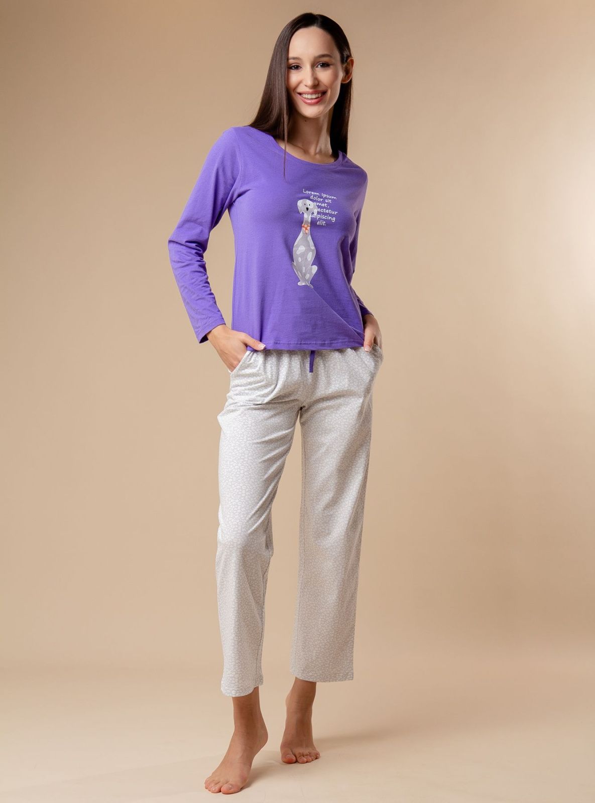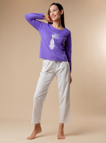 Домашняя пижама (Арт. 3228TCC) от торговой марки Indefini. В комплекте кофта и брюки. Кофта из хлопка, фиолетового цвета, с принтом и надписью, с длинными рукавами, прямая, свободного кроя. Брюки из хлопка, серого цвета, свободного кроя, на мягкой резинке, с регулирующим шнурком.