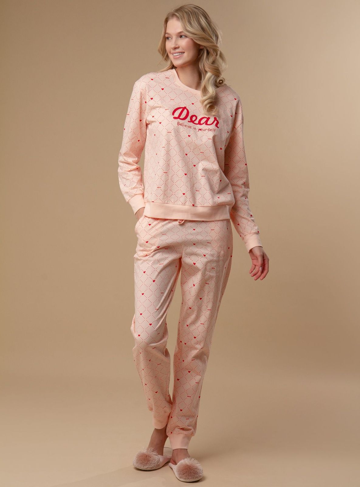 Женская пижама торговой марки Indefini, материнская серия. Женская пижама для девочек представляет собой комплект из кофты и брюк, созданные хлопка, обеспечивающем хорошую вентиляцию и воздухопроницаемость. Ткань мягкая и не растягивается после стирки.Кроме того, в костюме применен более популярный в этом году дизайн в форме ромба и принт в форме сердца, а комплект из серии "родитель-ребенок" создан для того, чтобы чувствовать себя полным любви. На пижаму нанесен яркий принт с мотивирующей надписью "Верь в себя" и рисунками сердечек. Эта женская пижама будет поддерживать уверенность и позитивное настроение у девушек и женщин, а также обеспечивать комфорт и уют во время сна. Верхний дизайн выполнен в более популярном в настоящее время дизайне с курсивными буквами.