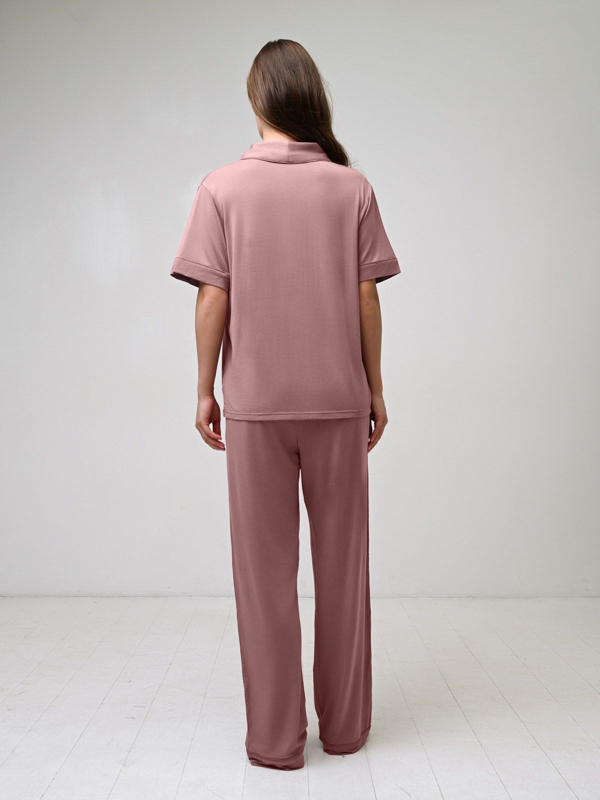Пижама женская 4265TBC бренда Indefini из модала приятная и мягкая на ощупь. Футболка свободного кроя позволяет свободно передвигаться и чувствовать комфорт. Она имеет короткие рукава, отложной воротник и застёгивающиеся пуговицы.