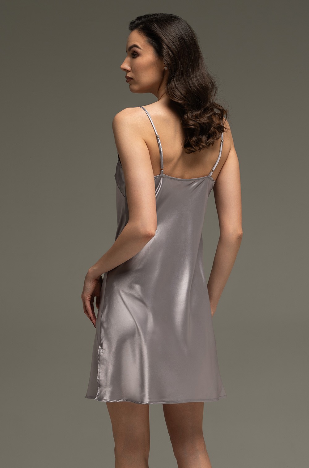 Короткая сорочка Mia-Amore на тонких регулируемых бретелях выполнена из однотонного смесового шёлка цвета серого опала. Лиф сорочки украшен кружевом и декоративным бантиком с подвеской.