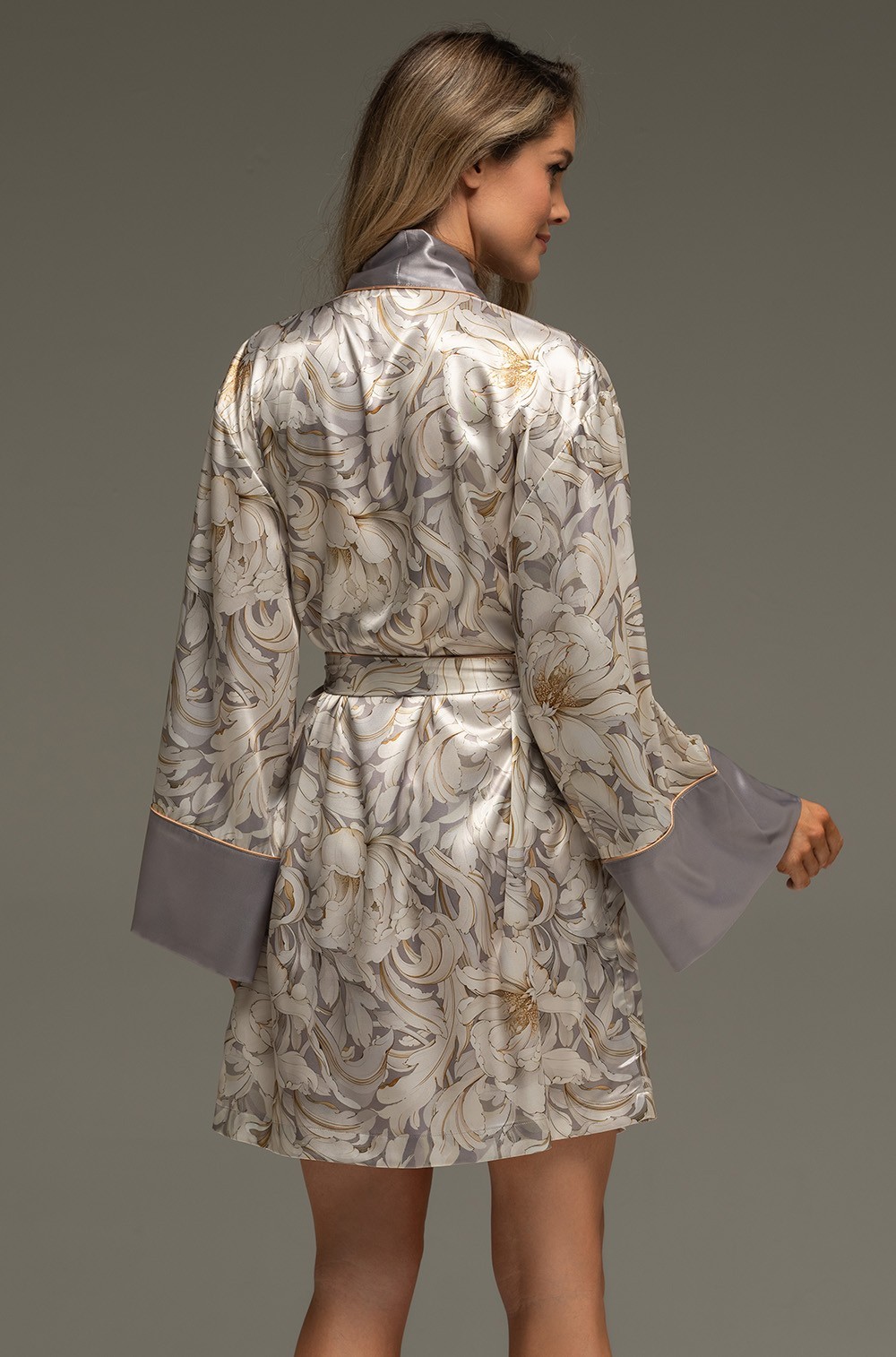 Короткий халат Mia-Amore выполнен из принтованного смесового шёлка. Планка и широкие манжеты цвета серого опала декорированы тонким золотым кантом. Широкий пояс халата украшен золотыми кисточками. В боковых швах есть карманы.