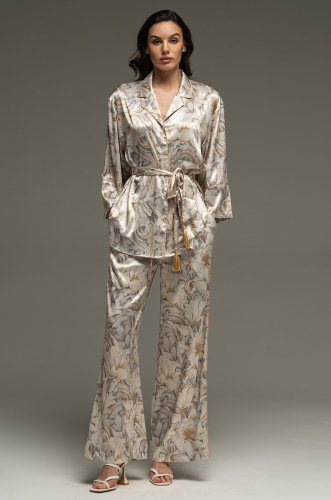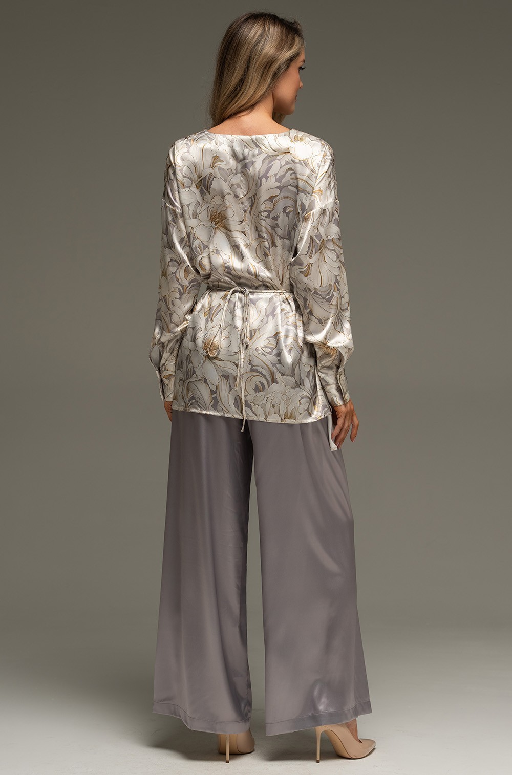 Элегантный праздничный комплект Mia-Amore выполнен из смесового шёлка, состоит из принтованной блузки с длинными рукавами и однотонных шёлковых брюк-палаццо цвета серого опала. Блузка-трансформер имеет оригинальный конструктив спереди, благодаря чему, подвязывающиеся передние полы блузки создают изысканную драпировку спереди и оригинальную форму низа, которая подчеркивает силуэт и скрывает недостатки фигуры. Комплект дополнен широкими однотонным брюками. В боковых швах брюк есть карманы.