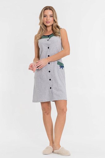 Молодёжный халат без рукавов выполнен из хлопковой ткани двух контрастных расцветок. Центральная застёжка на пуговицы, кокетка и планки на карманах из отделочного полотна. Карманы украшены декоративными бантиками.