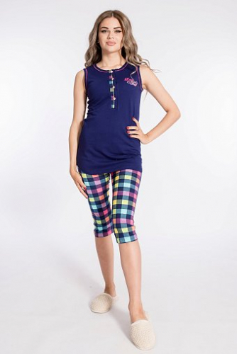 Костюм выполнен из хлопкового полотна. Майка однотонная, с круглым вырезом горловины с планкой с пуговицами. Спереди расположена вышивка. Капри из полотна с набивкой (клетка), пояс на резинке.