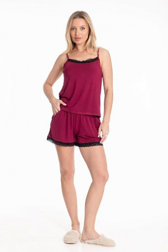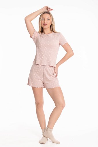 Пижама выполнена из мягкого и приятного к телу интерлока. Комплект состоит из футболки прилегающего силуэта с втачным рукавом и шорт на удобной резинке. Нежный образ завершают изящные детали: бантик и аккуратная отделка на микрооверлоке.