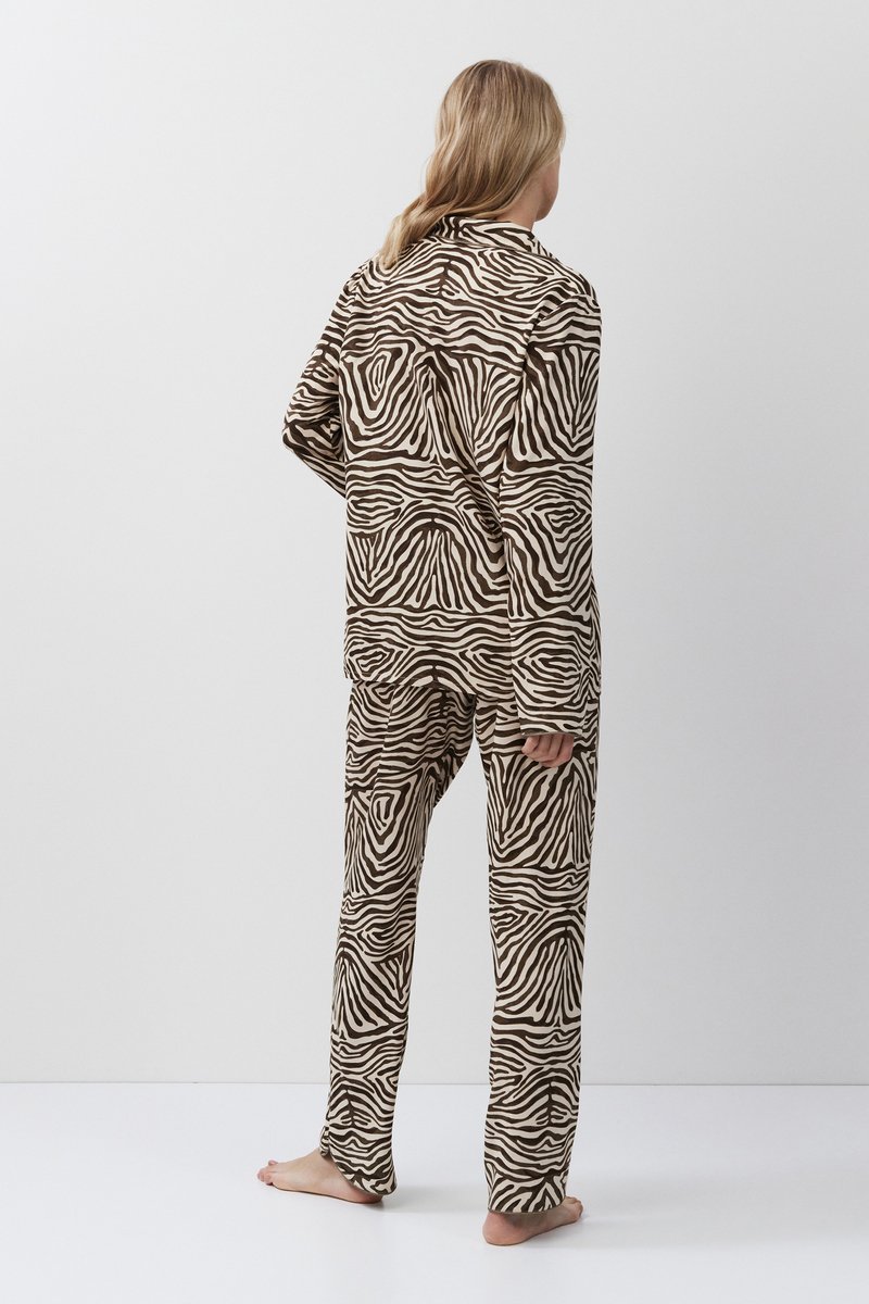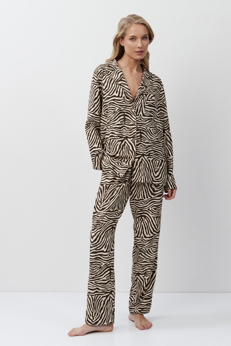 Пижама женская со штанами ELISE для вашего ночного комфорта. Пижама выполнена из вискозы с животным принтом. Рубашка на пуговицах, с длинными рукавами, отложным воротником и нагрудным карманом. Окантовка дополняет и украшает комплект. Штаны свободные, с эластичным поясом с завязкой. Расслабьтесь с максимальным комфортом и стилем в пижаме ELISE. 100% вискоза