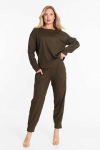 Костюм свободного силуэта выполнен из муслина. Состоит из футболки с цельнокроеным коротким рукавом с планкой и шорт. Пояс шорт на резине.