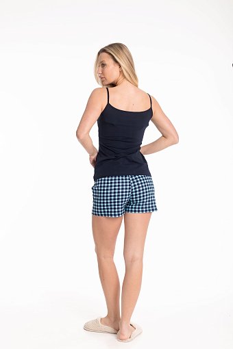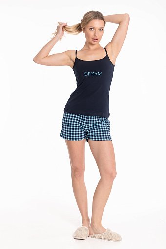 Женский комплект состоит из топа и шорт. Топ однотонный с принтом спереди, на тонких бретелях. Топ выполнен из кулирки с лайкрой. Шорты из кулирки с набивным рисунком, пояс на резине, по бокам с карманами.