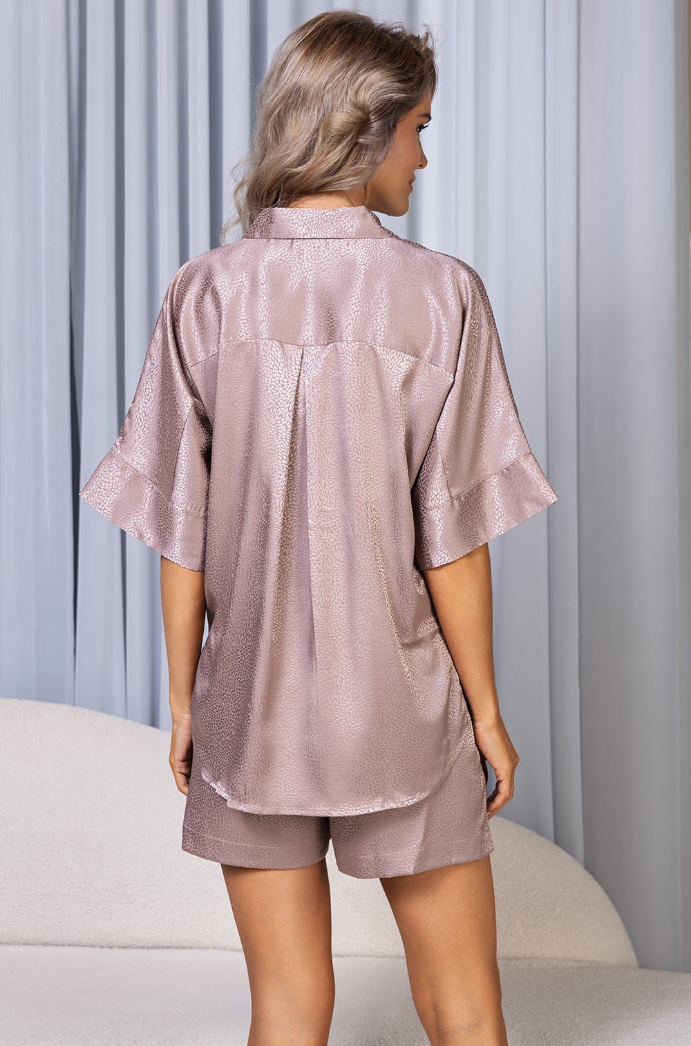 Комплект Mia-Amore состоит из рубашки и шорт, выполнен из жаккардового полотна из искусственных волокон. Рубашка свободного силуэта с короткими рукавами и центральной застежкой на пуговицы и английским воротником. Комфортные шорты свободного силуэта с декоративной завязкой на поясе.