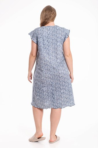 Женская сорочка выполнена из хлопкового полотна с набивным рисунком. Горловина оформлена бейкой из основного полотна. Низ рукавов и изделия обметаны декоративным стежком "пике".