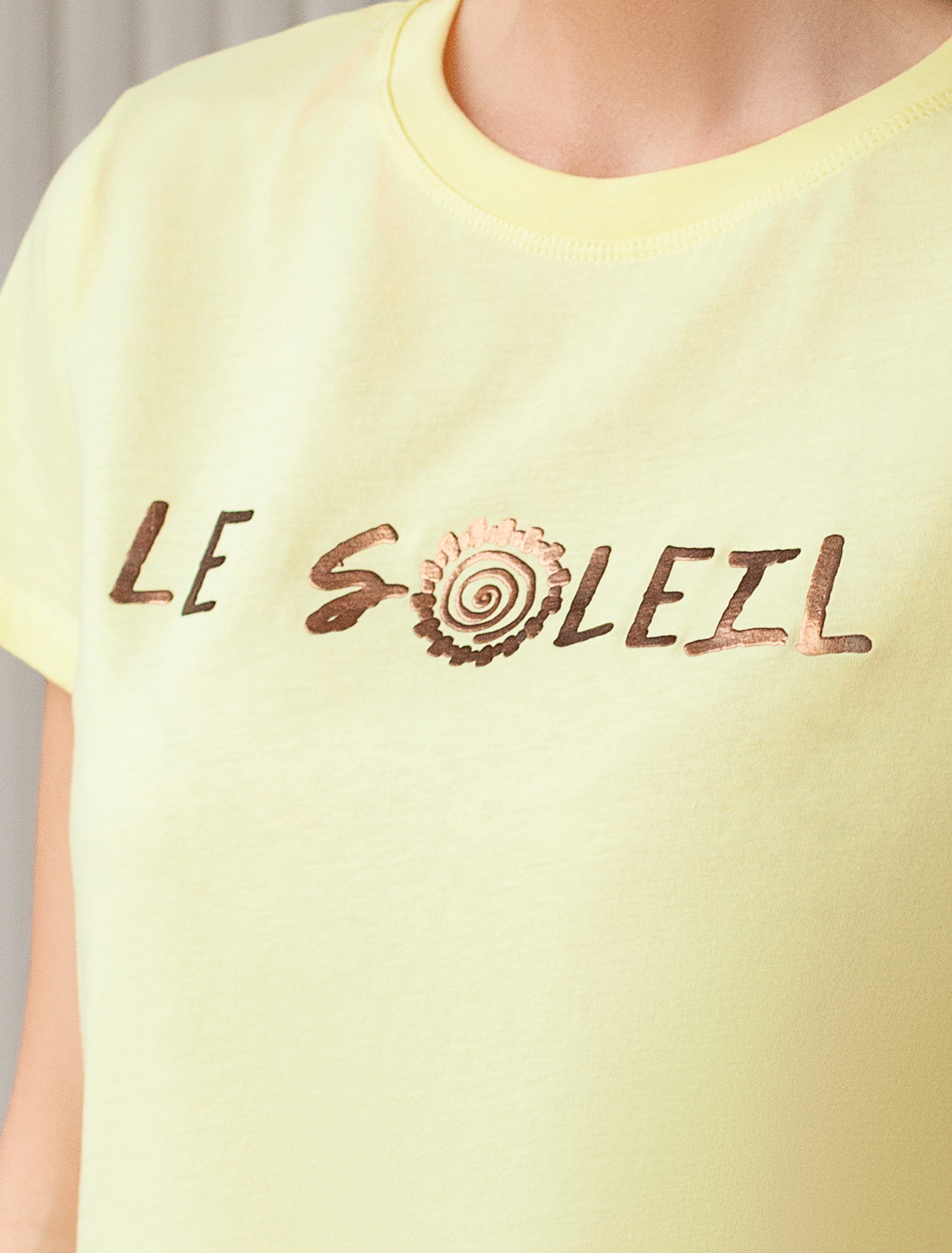 Перевод принта: "le soleil (фр.) - солнце". Футболка прямого кроя выполнена из 100% хлопка. Базовая модель дополнена лаконичным авторским принтом. Легко впишется в повседневный гардероб. Изделие хорошо держит форму и обеспечивает комфортный микроклимат в течение дня. лимонный_le_soleil