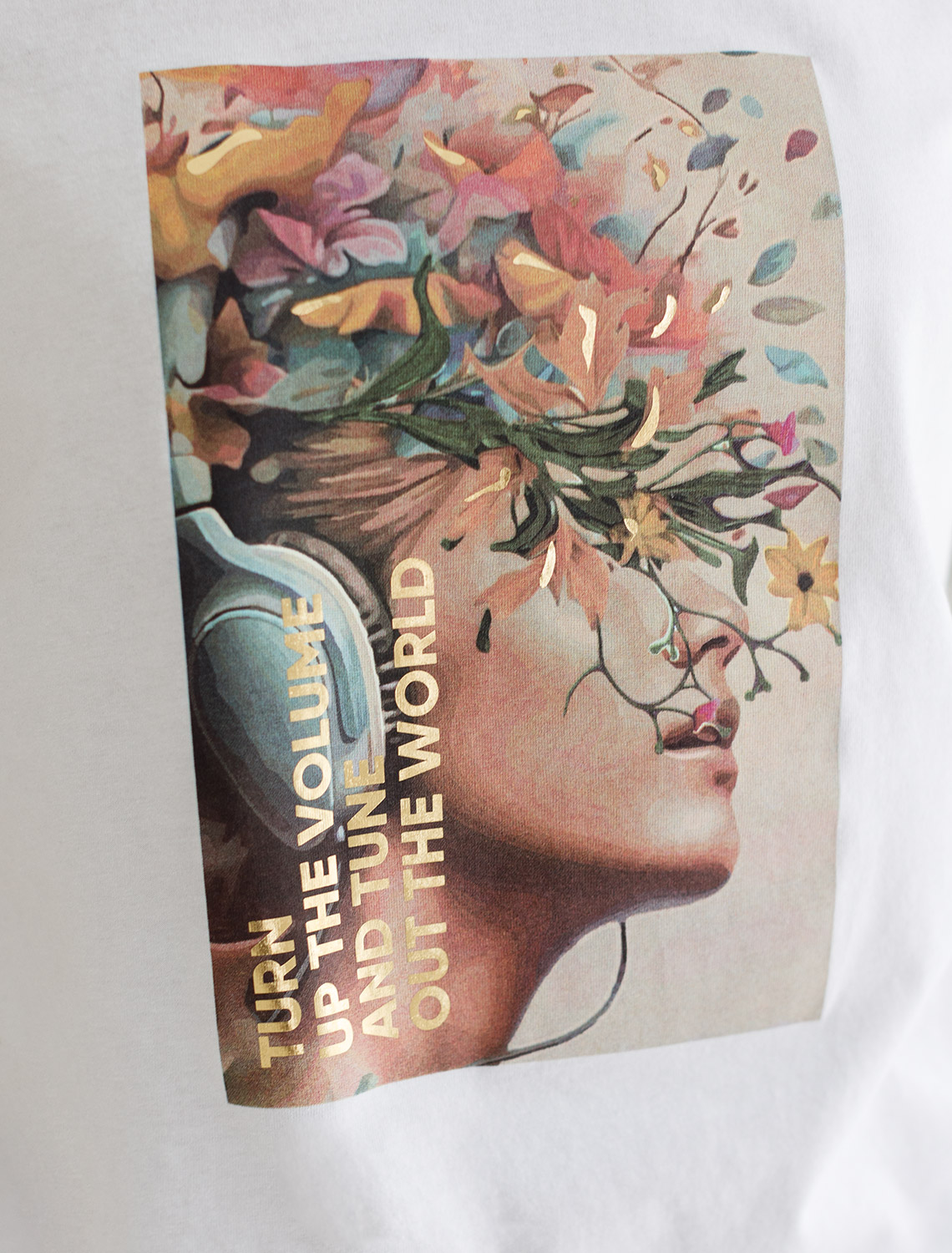 Перевод принта: Turn up the volume and tune out the world - сделай музыку громче и отключись от мира. Футболка прямого кроя выполнена из 100% хлопка. Базовая модель дополнена лаконичным авторским принтом. Легко впишется в повседневный гардероб. Изделие хорошо держит форму и обеспечивает комфортный микроклимат в течение дня. белый_turn up the volum