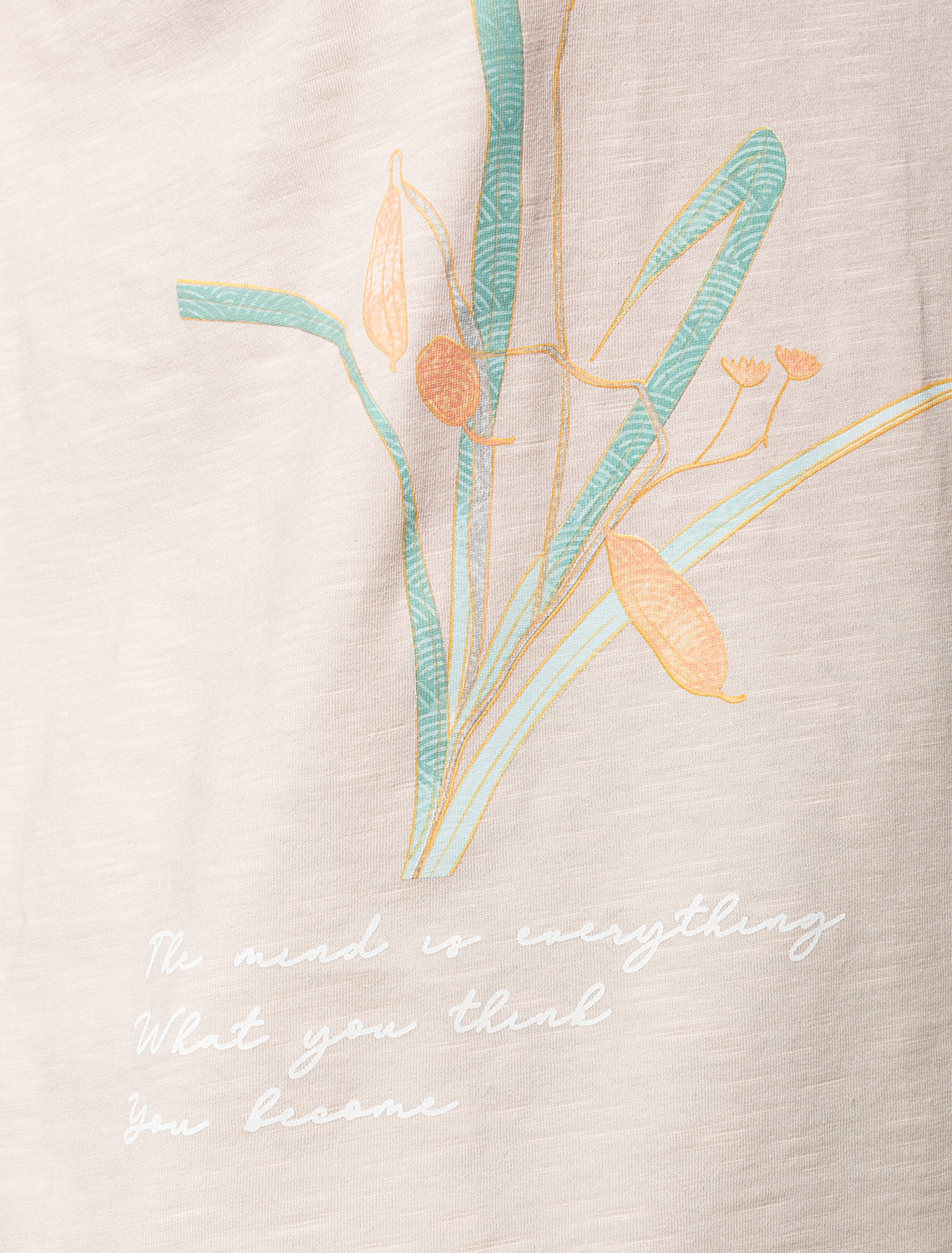 Перевод принта: The mind is everything, what you think you become - мысли материальны, ты то, о чем ты думаешь. Футболка выполнена из фактурного полотна из 100% хлопка. Модель с лаконичным авторским принтом легко впишется в любой весенне-летний гардероб. Ткань имеет характерный рисунок черточки за счет сочетания разных волокон хлопка 140-150 г. Хорошо держит форму и поддерживает комфортный микроклимат в течении дня. овсяный_the mind