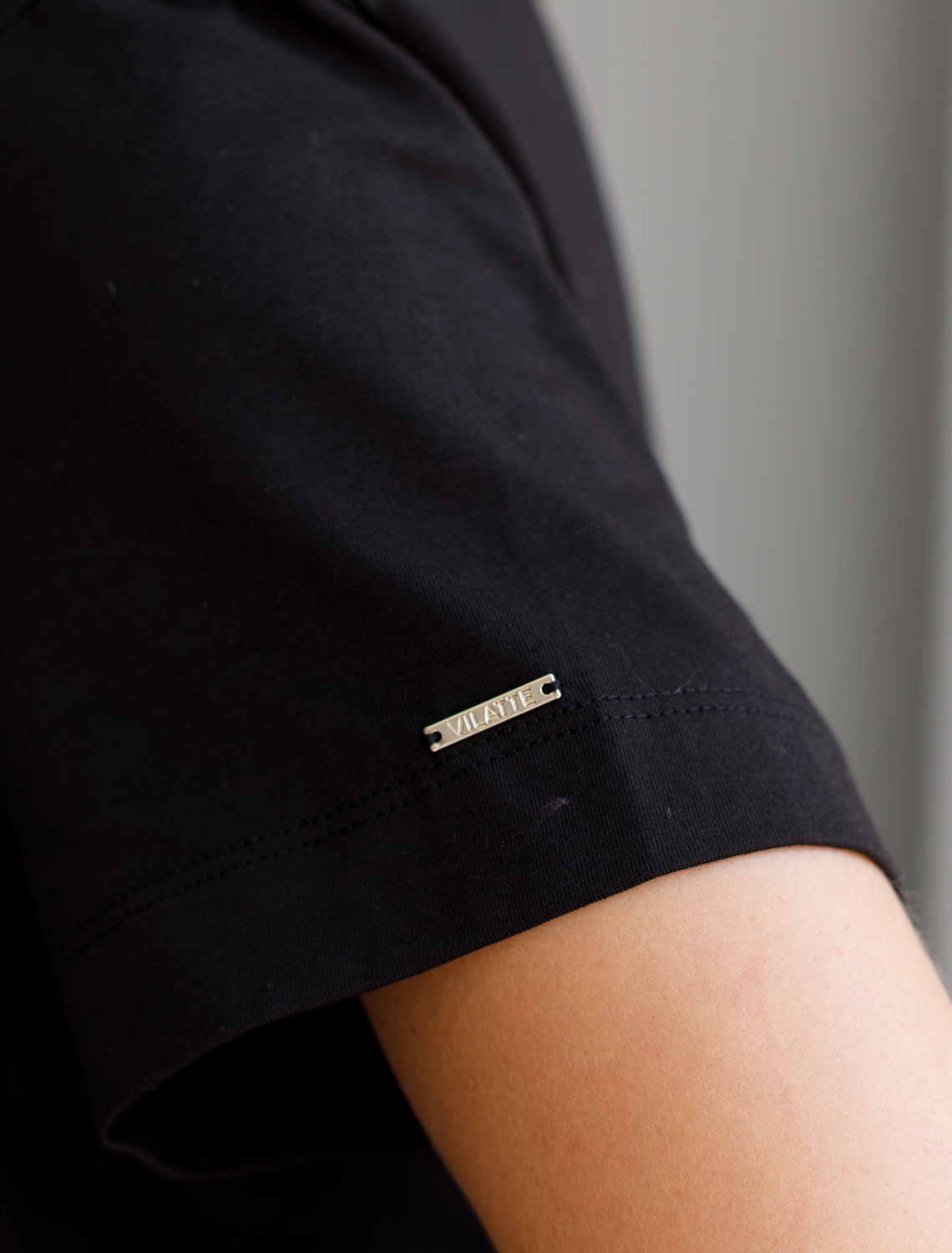 Футболка свободного силуэта выполнена из премиального хлопка.Наличие эластана в составе изделия позволит сохранить безупречный внешний вид в течение долгого времени. Изделие дополнено металлическим логотипом бренда на рукаве. черный