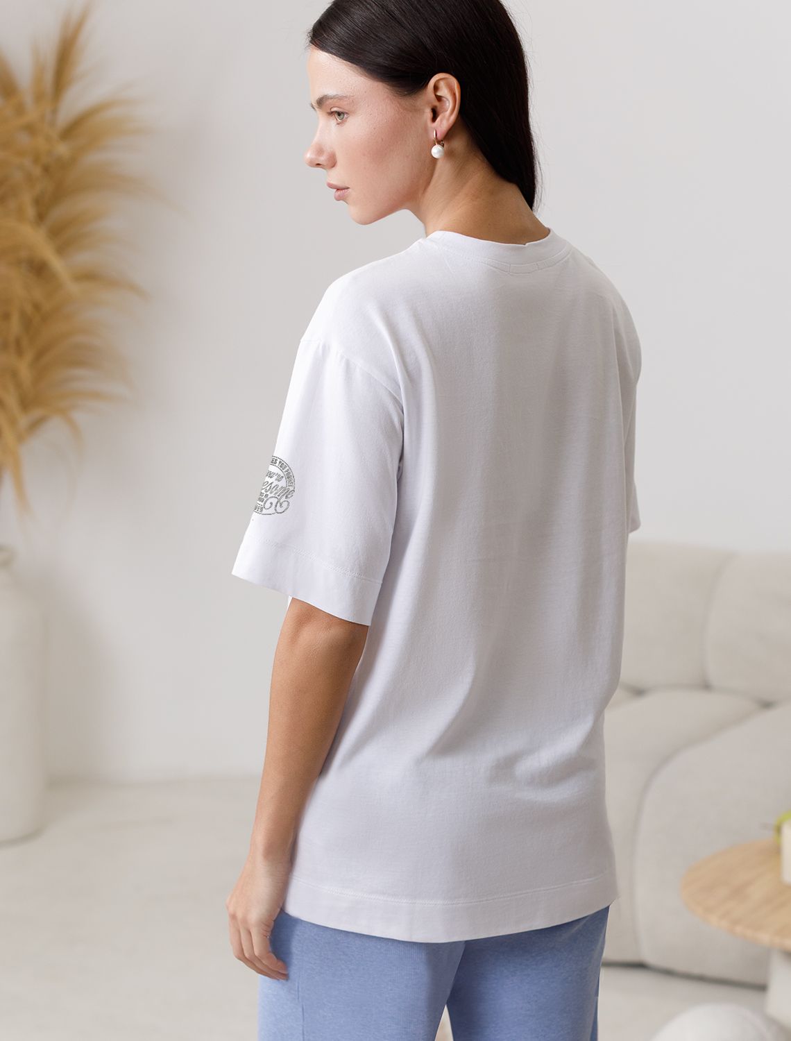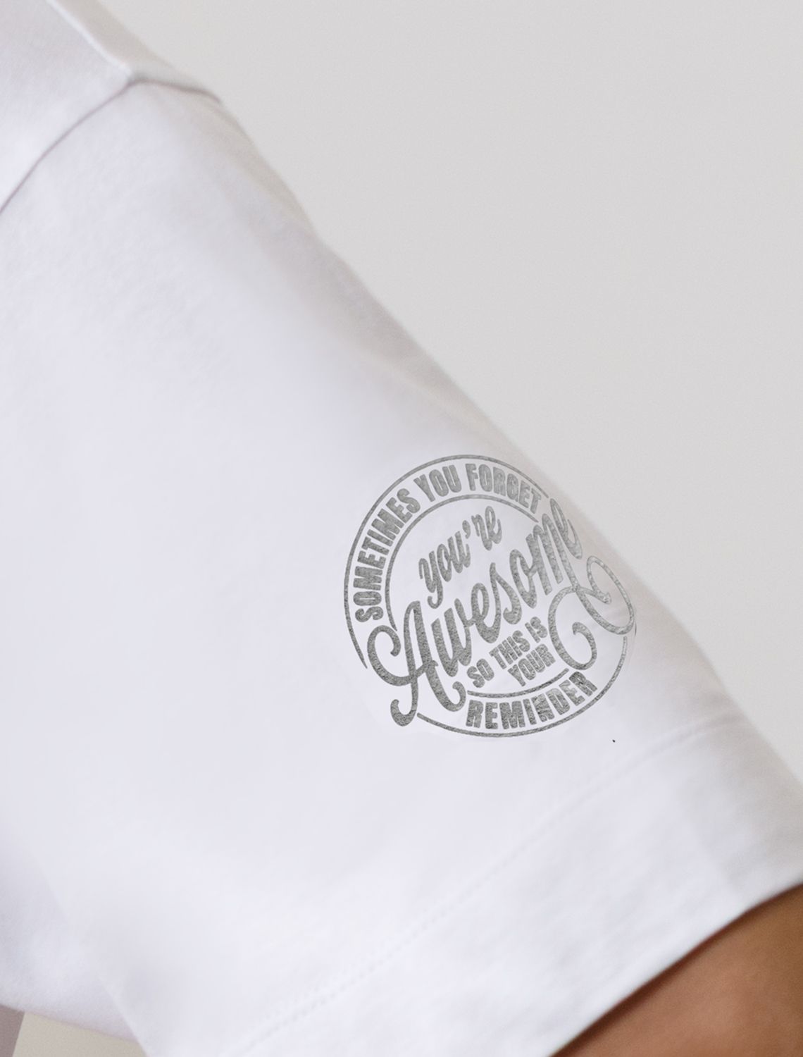 Оверсайз футболка белого цвета выполнена из премиального 100% хлопка плотностью 140 Г/м2. Главная особенность этого изделия — тонкое кулирное полотно, которое легче и воздушнее стандартного варианта. Благодаря своей деликатной текстуре футболка идеально подходит для домашних образов и пижамных комплектов. Ткань отлично дышит, обеспечивая максимальный уют во время сна и отдыха. Особое внимание привлекает стильный принт в виде надписи на рукаве. Перевод надписи: Sometimes you forget Reminder You re Awesome So tnis is your - Иногда ты забываешь, как ты крута, так что это твое напоминание. Принт выполнен красками с устойчивым покрытием, который добавляет футболке оригинальности и позволяет выразить индивидуальность. Свободный крой футболки дарит удобство и не стесняет движений, что делает ее идеальной для повседневной носки или активного отдыха, подчеркивает современный взгляд на моду. Подойдет девушкам и женщинам на любую фигуру, вы будете чувствовать себя в ней уверенно и комфортно. Отлично впишется в гардероб благодаря универсальному дизайну, который легко сочетать с любыми низами.