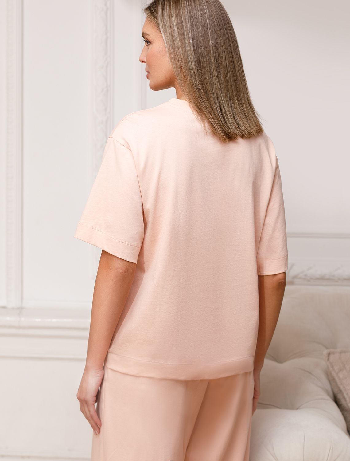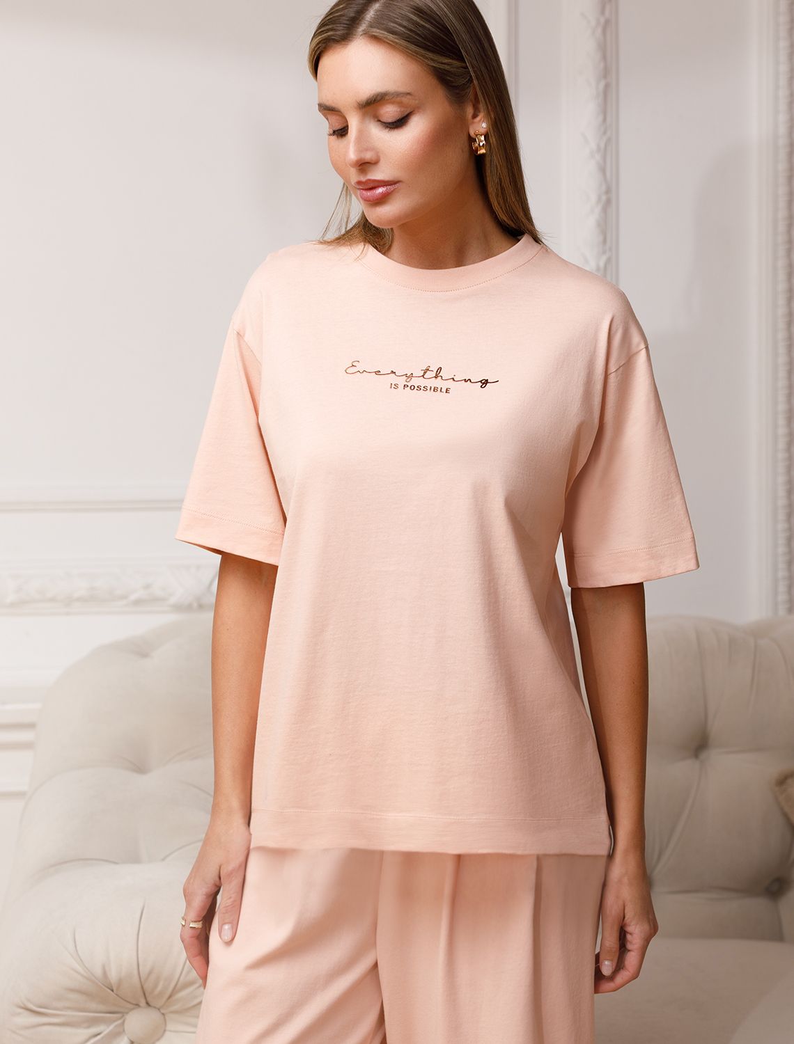 Оверсайз футболка пудрового цвета выполнена из премиального 100% хлопка плотностью 140 Г/м2. Главная особенность этого изделия — тонкое кулирное полотно, которое легче и воздушнее стандартного варианта. Благодаря своей деликатной текстуре футболка идеально подходит для домашних образов и пижамных комплектов. Ткань отлично дышит, обеспечивая максимальный уют во время сна и отдыха. Особое внимание привлекает стильный принт в виде надписи. Перевод надписи: Everything is possible - Все возможно. Принт выполнен красками с устойчивым покрытием, который добавляет футболке оригинальности и позволяет выразить индивидуальность. Свободный крой футболки дарит удобство и не стесняет движений, что делает ее идеальной для повседневной носки или активного отдыха, подчеркивает современный взгляд на моду. Подойдет девушкам и женщинам на любую фигуру, вы будете чувствовать себя в ней уверенно и комфортно. Отлично впишется в гардероб благодаря универсальному дизайну, который легко сочетать с любыми низами.